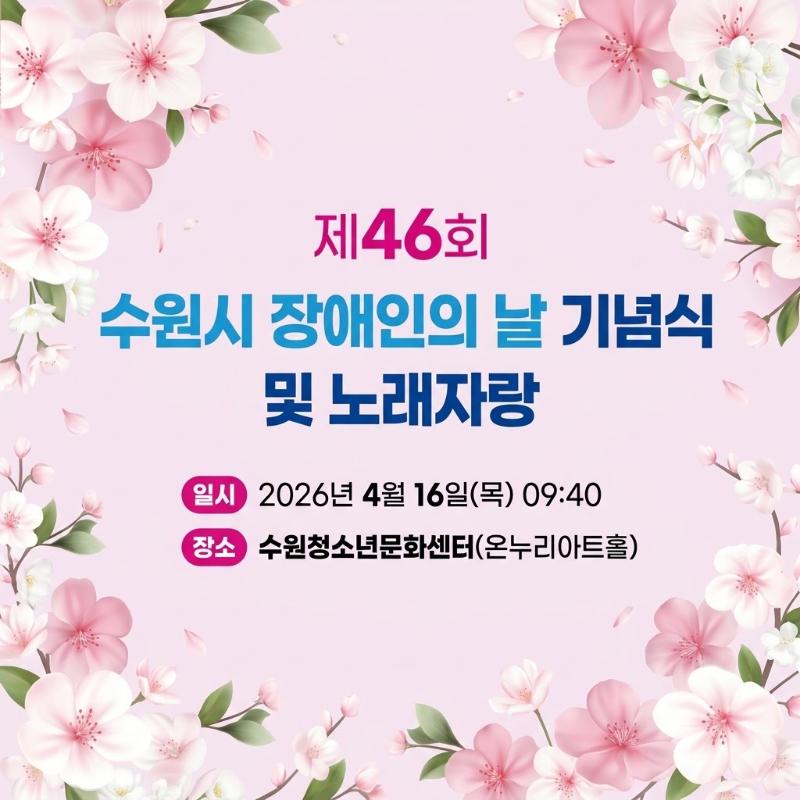 제46회 수원시 장애인의 날 기념식 및 노래자랑, 일시: 2026년 4월 16일(목) 09:40, 장소: 수원청소년문화센터(온누리아트홀)