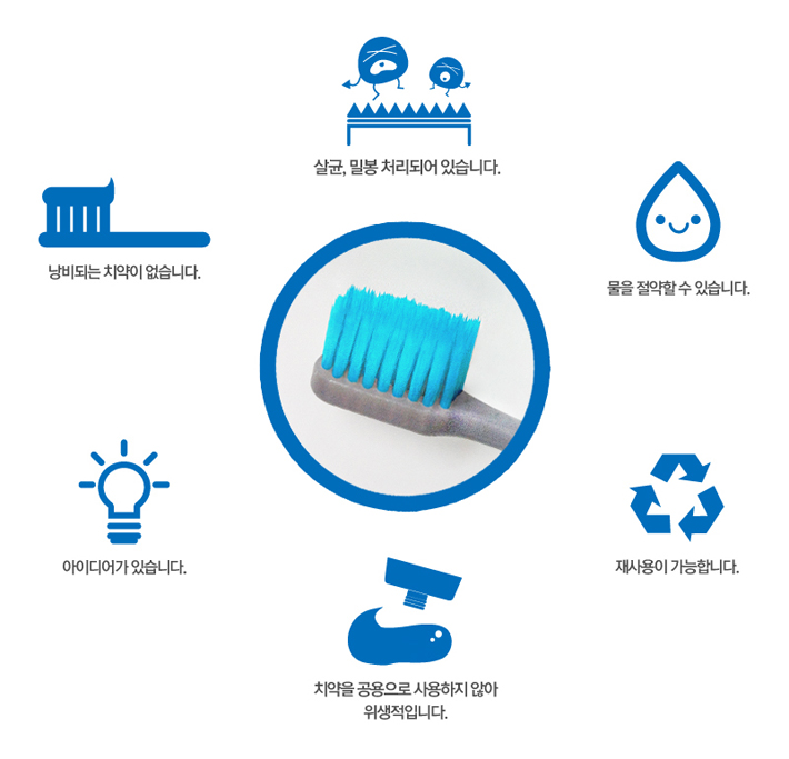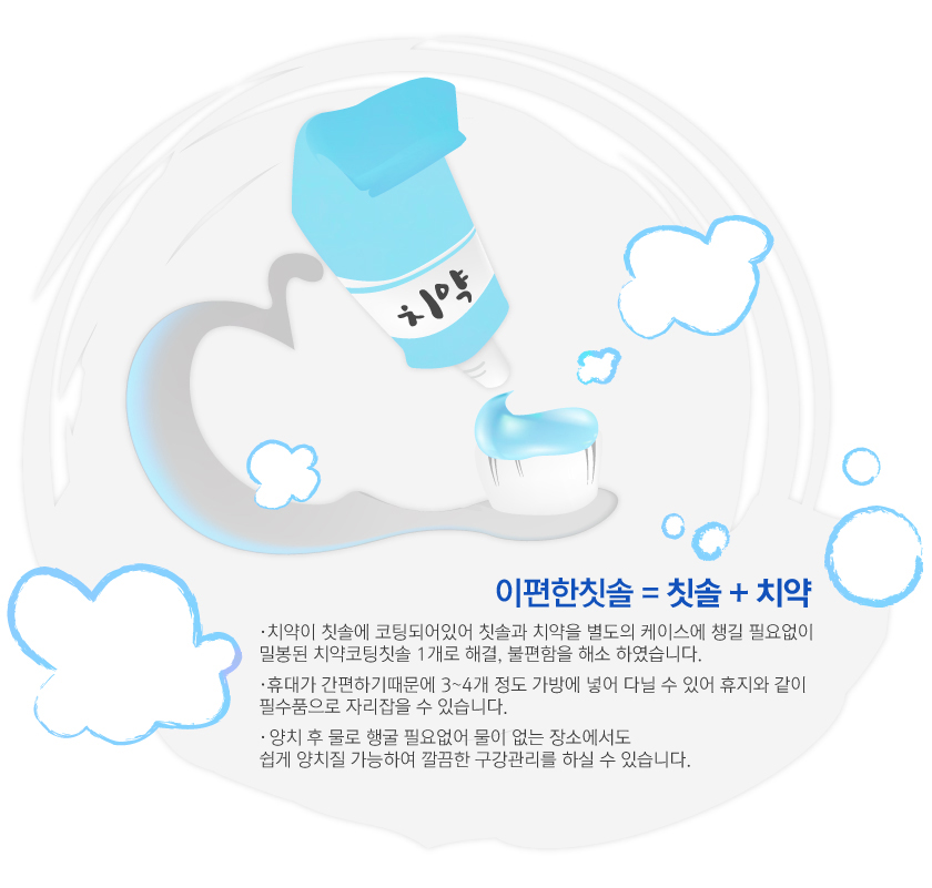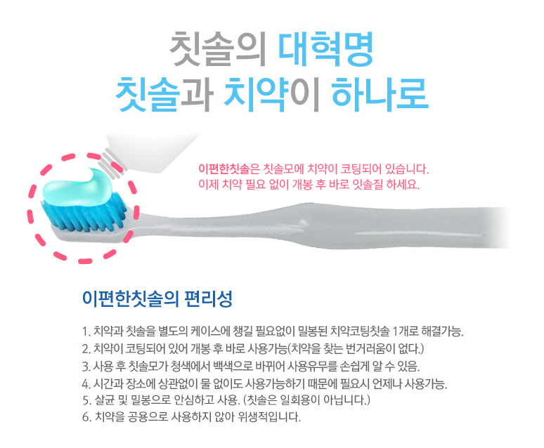 이제는 이편한칫솔만 있으면 치약을 따로 준비해야 하는 번거로움 없이 바로 사용할 수 있습니다.