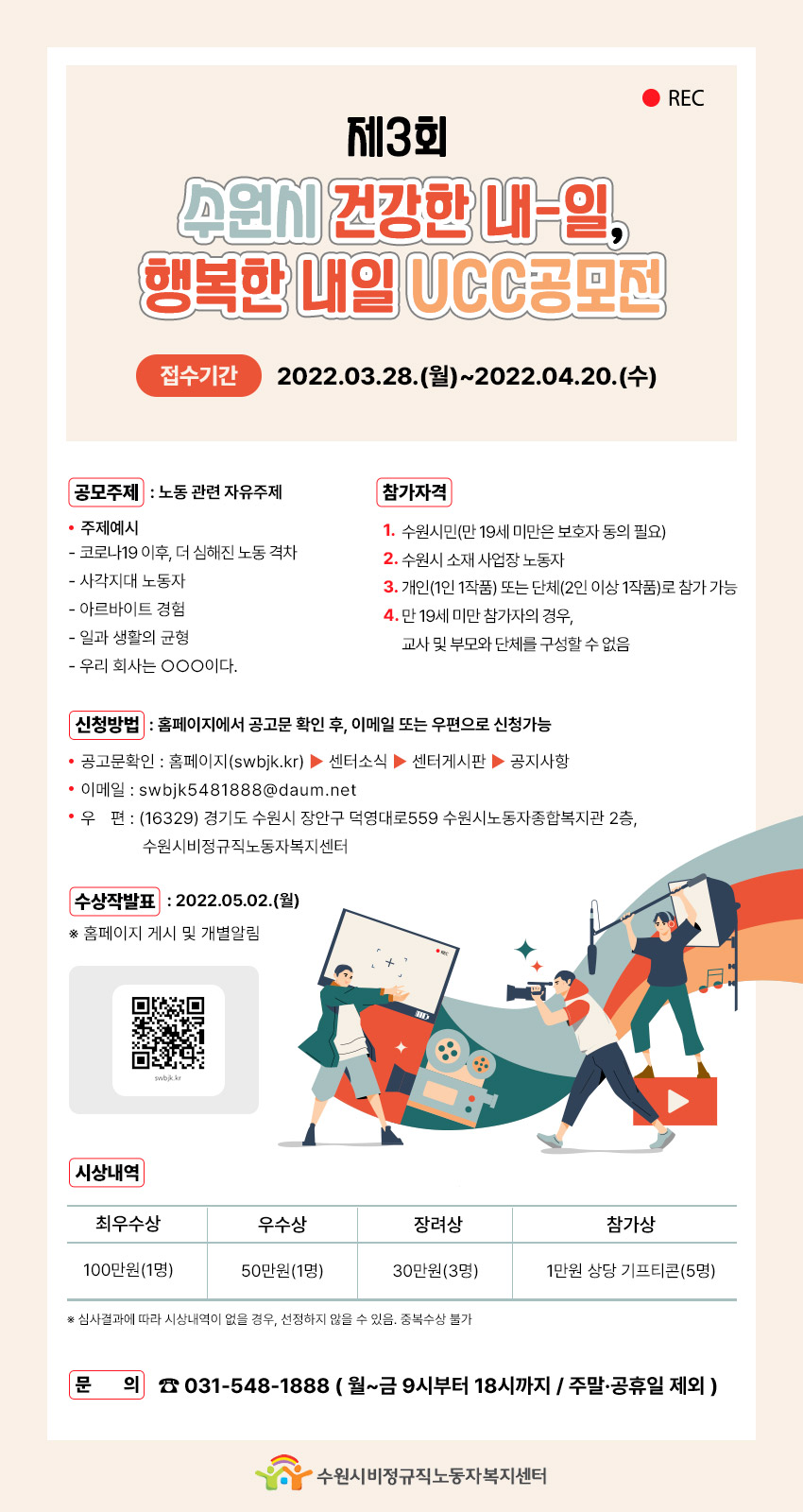 수원시 비정규직노동자복지센터에서는 제3회 수원시 건강한 내^일, 행복한 내일 UCC공모전을 개최합니다. 이 공모전은 건강한 노동문화 조성을 목적으로 진행되는 시민참여형 공모전입니다. ▣ 접수기간: 2022.03.28.(월)~04.20.(수) ▣ 공모주제: 노동 관련 자유주제 UCC 동영상 ▣ 참가자격 1) 수원시민(만 19세 미만은 보호자 동의 필요) 2) 수원시 소재 사업장 노동자 3) 개인(1인 1작품) 또는 단체(2인 이상 1작품)로 참가 가능 4) 만 19세 미만 참가자의 경우, 교사 및 부모와 단체를 구성할 수 없음 ▣ 응모방법 1) 이메일(swbjk5481888@daum.net) 영상 제출 2) 저장매체로 우편 제출(원본제출) ∙ 우 편 : 경기도 수원시 장안구 덕영대로559 수원시노동자종합복지관 2층 ▣ 문의 : 수원시 비정규직노동자복지센터(☎ 031-548-1888) 또는 홈페이지 (http://www.swbjk.kr) 공지사항 확인 |