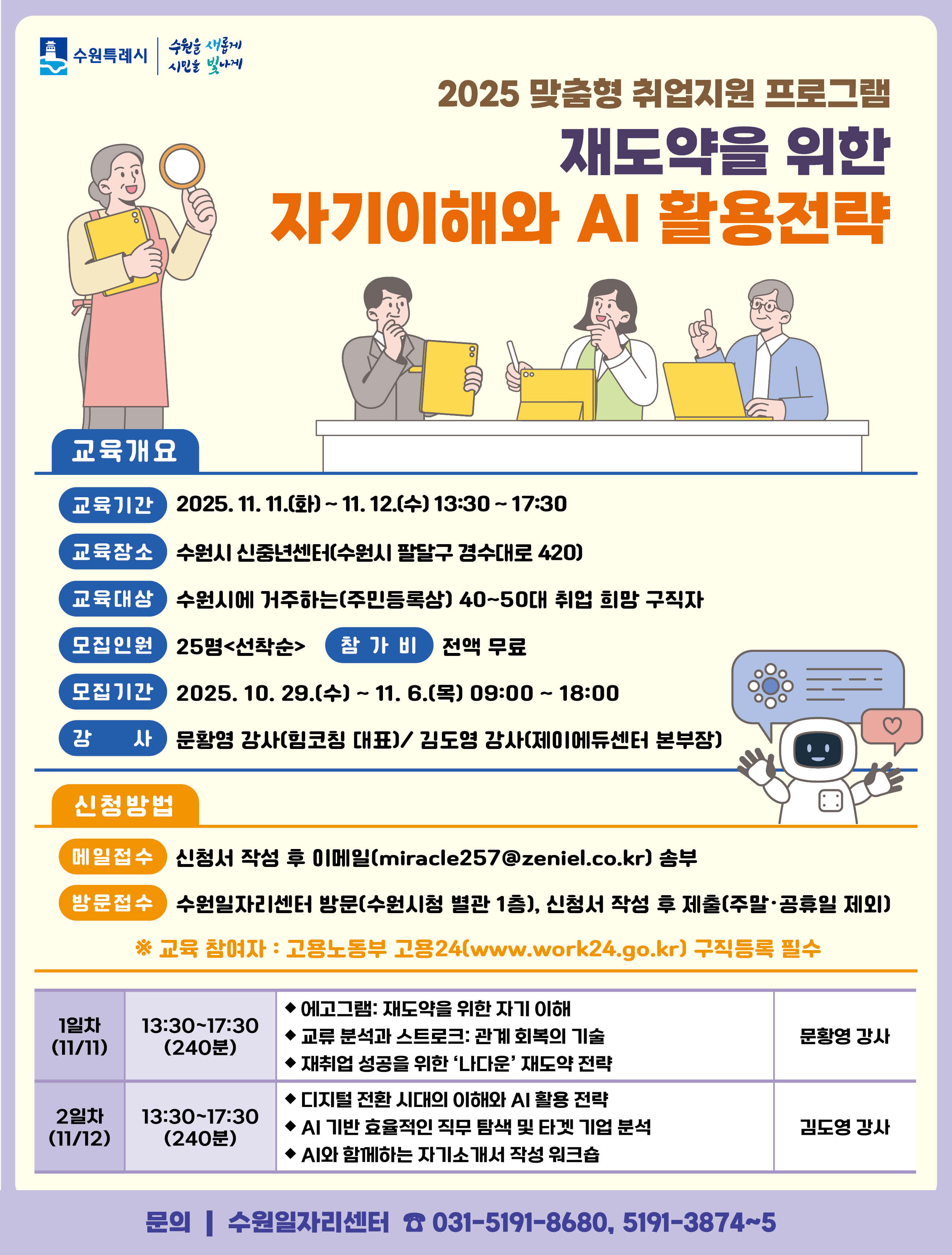 중장년 구직자의 성공적인 재취업을 도모하기 위한 「중장년 취업지원 교육」 “재도약을 위한 자기이해와 AI활용 전략” 을 아래와 같이 운영하오니 , 구직자들의 많은 참여 바랍니다. ○ 모집기간 : 2025. 10. 29.(수) ~ 11. 6.(목) 09:00~18:00(주말·공휴일 제외) ○ 모집인원 : 25명(선착순) ○ 모집대상 : 우리시 거주(주민등록상) 40~50대 취업희망 구직자 ○ 접수방법 - 메일접수 : 신청서 작성 후 이메일(miracle257@zeniel.co.kr) 송부 - 방문접수 : 수원일자리센터 방문(수원시청 별관 1층), 신청서 작성 후 제출(주말,공휴일 제외) ※ 교육참여자 고용노동부 고용24(www.work24.go.kr) 구직등록 필수 < 중장년 취업지원 교육 “ 재도약을 위한 자기이해와 AI활용 전략 ” 개요 > ○ 교육기간 : 2025. 11. 11.(화) ~ 11. 12.(수) 13:30~17:30 ○ 교육장소 : 수원시 신중년센터(수원시 팔달구 경수대로 420) ○ 교육강사 : 문황영 강사(힘코칭 대표), 김도영 강사(제이에듀센터 본부장) ○ 참 가 비 : 전액 무료 ○ 교육내용 : (붙임 1) 안내문 참조 ○ 문의전화 : 수원일자리센터 (☎031-5191-8680, 3874~5) |