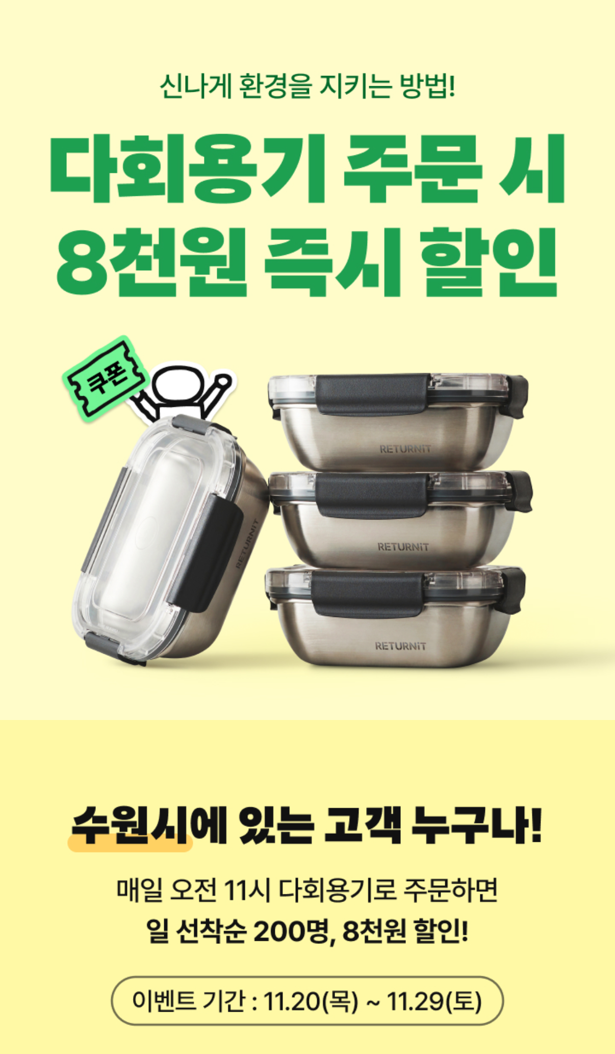 ['친환경 배달 다회용기' 혜택 안내] 수원 시민은 '다회용기'로 주문하면 최대 9,000원 혜택 지급!지금 배달앱에서 '다회용기'로 주문해보세요.*배달앱 : 배달의민족, 땡겨요, 요기요, 배달특급