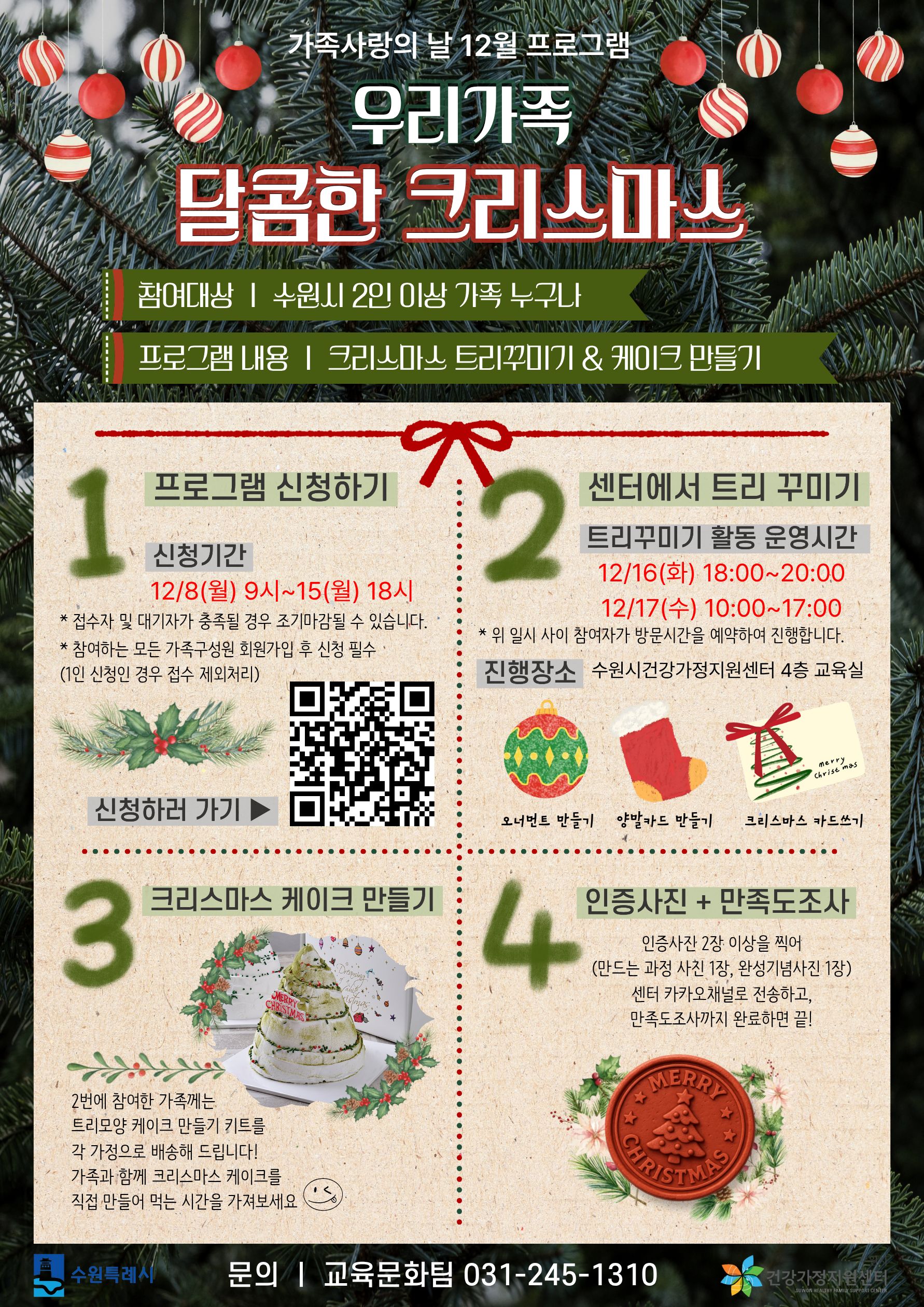 수원시건강가정지원센터에서는 지역 가족 대상 문화체험 활동을 지원하여 가족구성원간의 의사소통 및 친밀감 증진, 일 생활 균형의 가족문화를 확산하기 위해 2025 가족사랑의 날 사업을 추진합니다. 가. 사 업 명: 12월 가족사랑의 날 – 우리가족 달콤한 크리스마스 나. 신청기간: 2025년 12월 8일(월) 9시 ~ 15(월) 18시 다. 신청방법: (홍보지 QR코드 이용가능) 센터 홈페이지 내 신청 라. 내 용: 크리스마스 트리 꾸미기 및 케이크 만들기 가족활동 지원 마. 대 상: 수원시 거주 중인 2인 이상 가족 누구나, 15가족 모집 바. 지 원: 크리스마스 트리 꾸미기 재료 및 케이크 만들기 재료비 무료 |