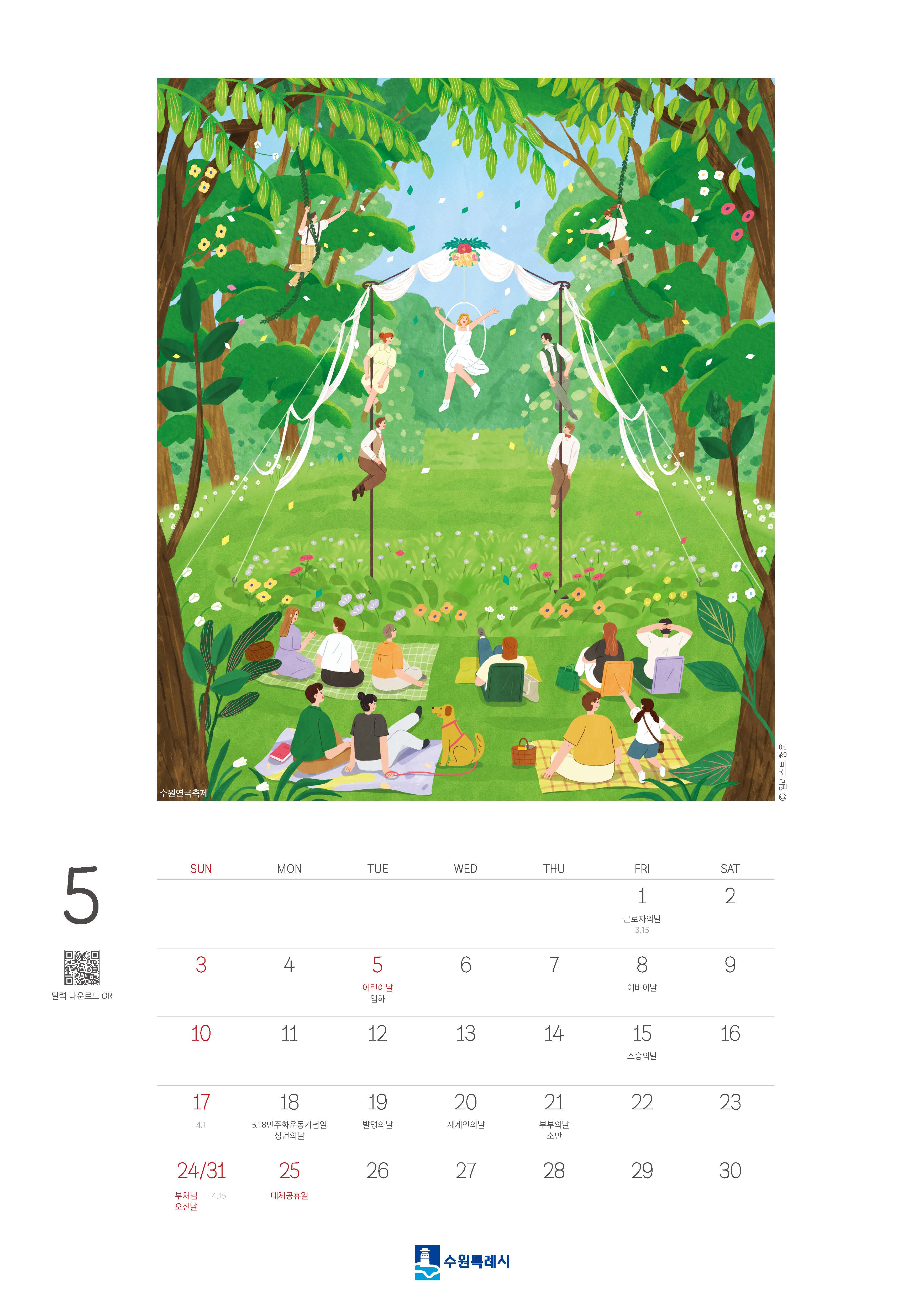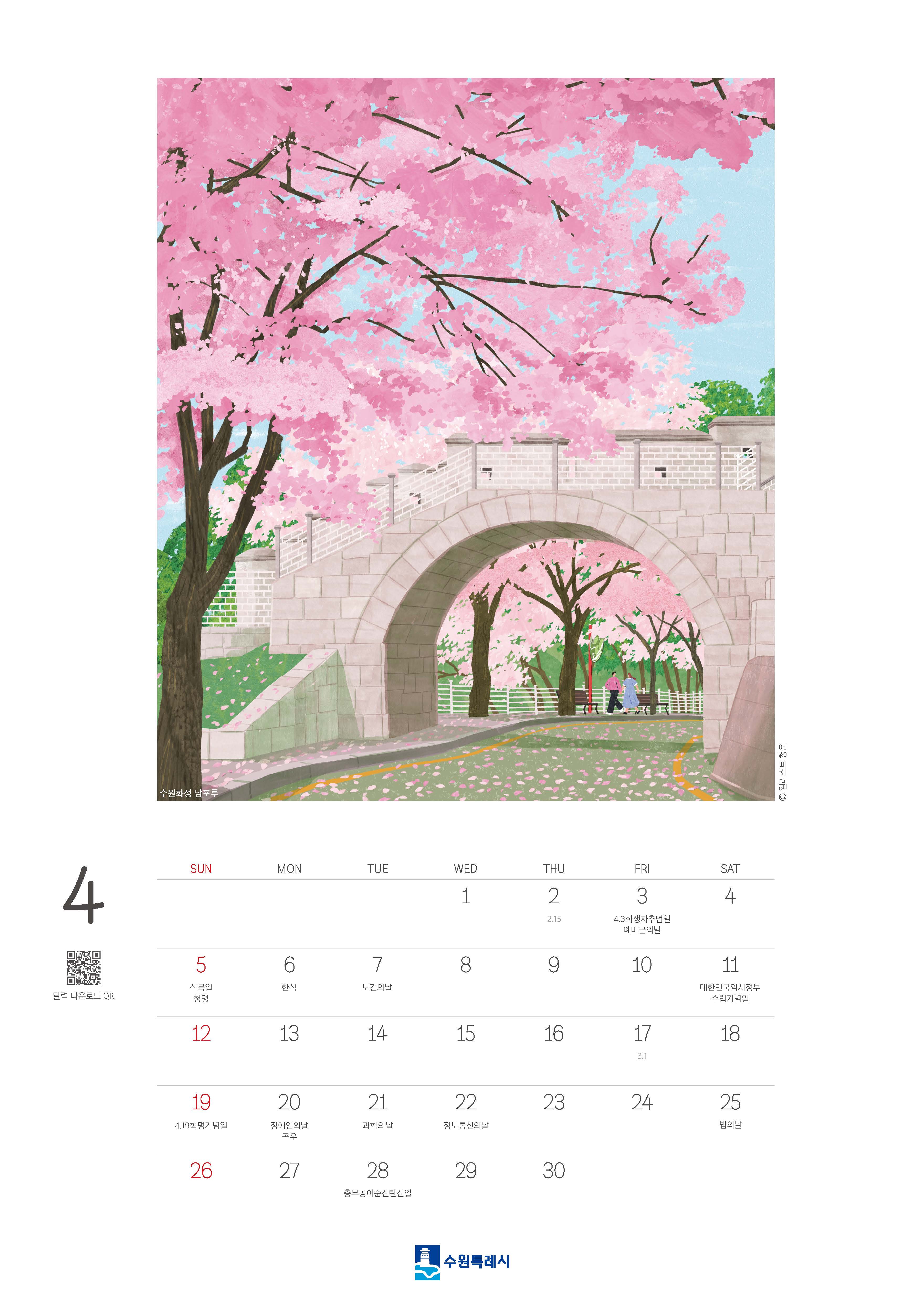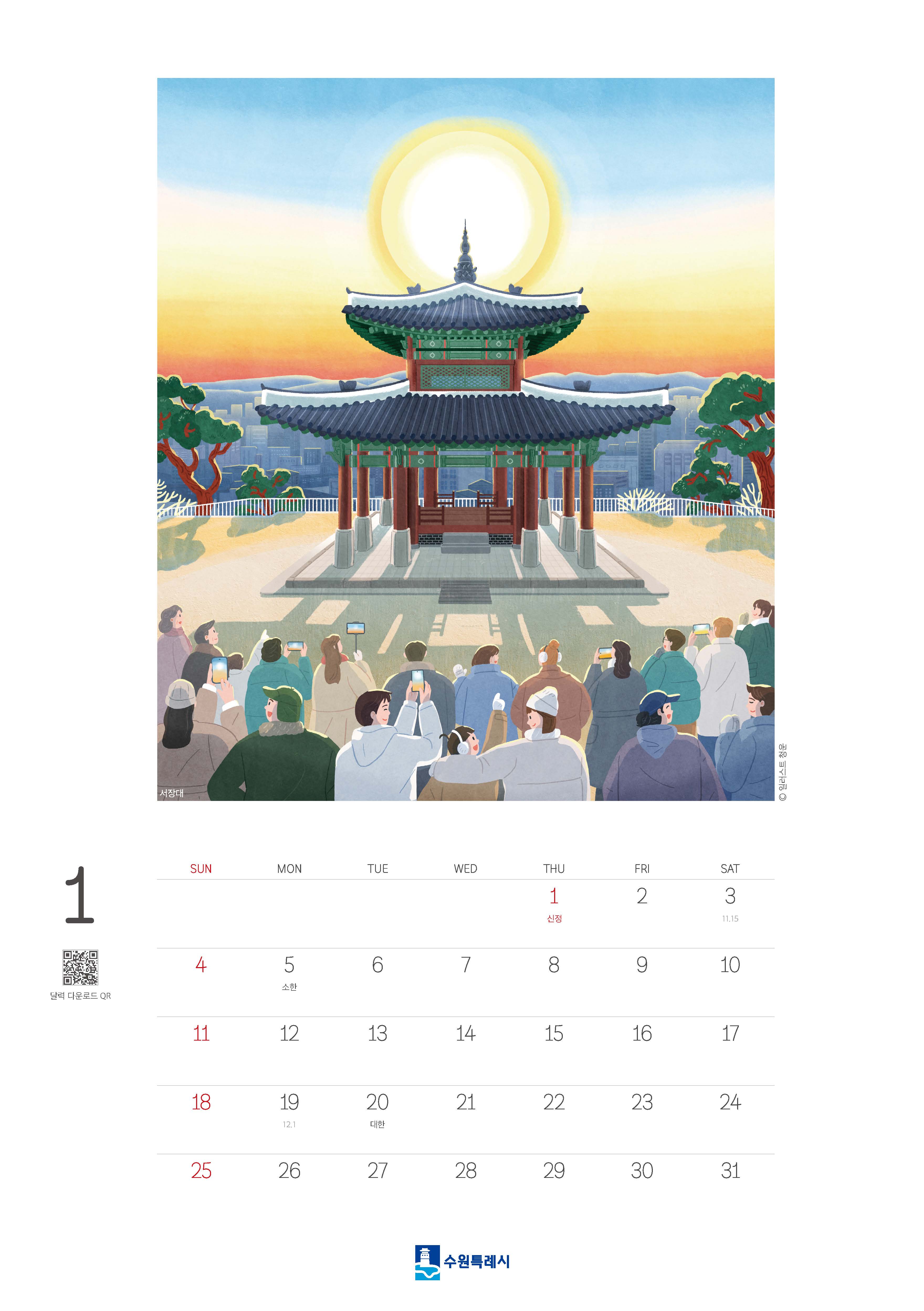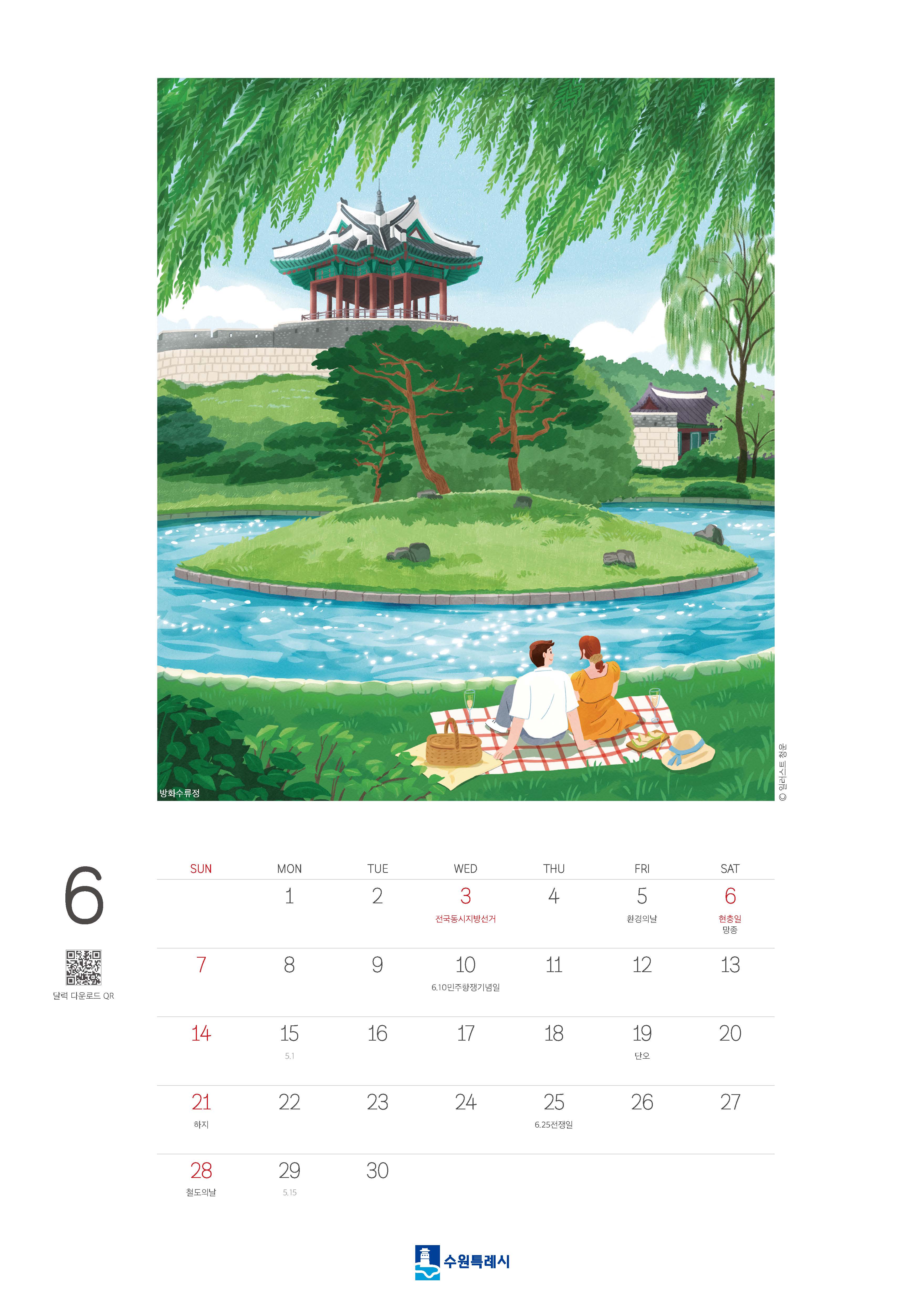 2026년 수원시 달력 이미지(1월~6월)입니다. 이미지를 다운로드하여 사용해 주세요~ ![]() ![]() ![]() ![]() ![]() ![]() ★★7~12월 달력 이미지 다운 받는 페이지 클릭★★ ※ 해당 일러스트 달력은 판매용이 아닌 비매품으로, 판매 계획이 없습니다. ※ 2026년 수원시 홍보 달력 이미지의 저작권은 수원시에 있습니다. 원작자와 수원시 홍보기획관의 명시적 허락 없이 무단 전제와 복제, 2차 가공, AI 수집 등 변형하여 사용할 수 없습니다. 이를 위반할 경우 민·형사상 책임을 질 수 있습니다. |