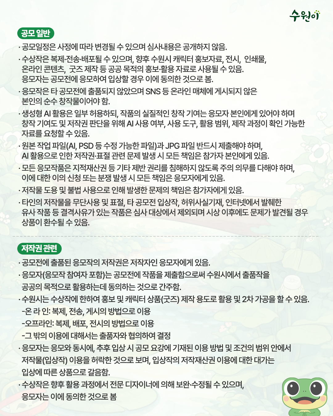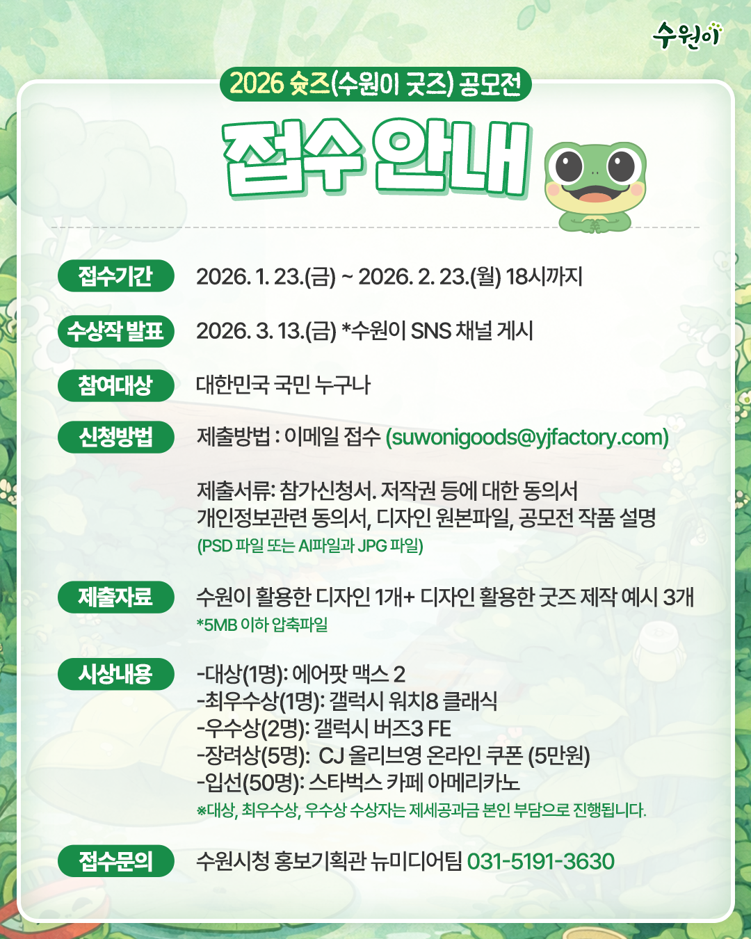 수원소식 시정소식 상세내용(게시판 상세내용으로 제목,등록자명,부서명,전화번호,등록일시,조회수,첨부파일,내용 정보를 제공합니다.) 2026 슛즈(수원이굿즈) 공모전 참여 안내 작성자 : 윤미지 작성일 : 2026/01/23 조회 : 59 부서명 뉴미디어팀 전화번호 031-5191-3066 첨부파일 png 수원이굿즈_공모전_01_qr_최종.png (1 MB, png) 미리보기 hwp 2026_수원이 굿즈 아이디어 공모전_신청서및개인정보동의서.hwp (48 KB, hwp) 미리보기/음성듣기 hwp 2026_수원이 굿즈 아이디어 공모전_공고문.hwp (68 KB, hwp) 미리보기/음성듣기 hwp 2026_수원이 굿즈 아이디어 공모전_유의사항.hwp (78 KB, hwp) 미리보기/음성듣기 png 수원이굿즈_공모전_02_qr_최종.png (1 MB, png) 미리보기 png 수원이굿즈_공모전_03_qr_최종.png (1 MB, png) 미리보기 🐸2026 ‘수원이 캐릭터 슛즈(수원이 굿즈) 공모전’ !🐸 💚[접수기간]-2026. 1. 23.(금) ~ 2. 23.(월) , PM 6:00 💚[발표]-2026. 3. 13.(금) (수원이 SNS, 인스타그램 게시) 🏆[시상내용] -대상(1명): 에어팟 맥스 2 -최우수상(1명): 갤럭시 워치 8 클래식 -우수상(2명): 갤럭시 버즈3 FE -장려상(5명):CJ올리브영 온라인 쿠폰(5만원) -입선(50명):스타벅스 카페 아메리카노 📌 접수문의: 수원시청 홍보기획관 뉴미디어팀031-5191-3630 *자세한 내용은 수원이 캐릭터 SNS(인스타그램) 및 첨부파일을 참고하세요! https://www.instagram.com/p/DT1iVVagRhC/?utm_source=ig_web_copy_link&igsh=MzRlODBiNWFlZA== 등록된 태그가 없습니다. 목록 이전글 환경친화적 자동차 충전방해 행위 및 주차위반 등 주민신고제 운영기준 변경 안내 다음글 2026년 하반기 수원시립만석전시관(수원시립북수원전시관) 정기대관 접수 공고 공유 페이스북 공유 트위터 공유 공유링크 복사 댓글 로그인 후 사용 가능합니다. 댓글 등록하기 댓글 수정하기 수원시청이 창작한 2026 슛즈(수원이굿즈) 공모전 참여 안내 저작물은 "공공누리" 출처표시-상업적이용금지-변경금지 조건에 따라 이용 할 수 있습니다. 콘텐츠 만족도 조사 이 페이지에서 제공하는 정보에 대하여 어느 정도 만족하셨습니까? 만족도 조사 매우만족 만족 보통 불만족 매우불만족