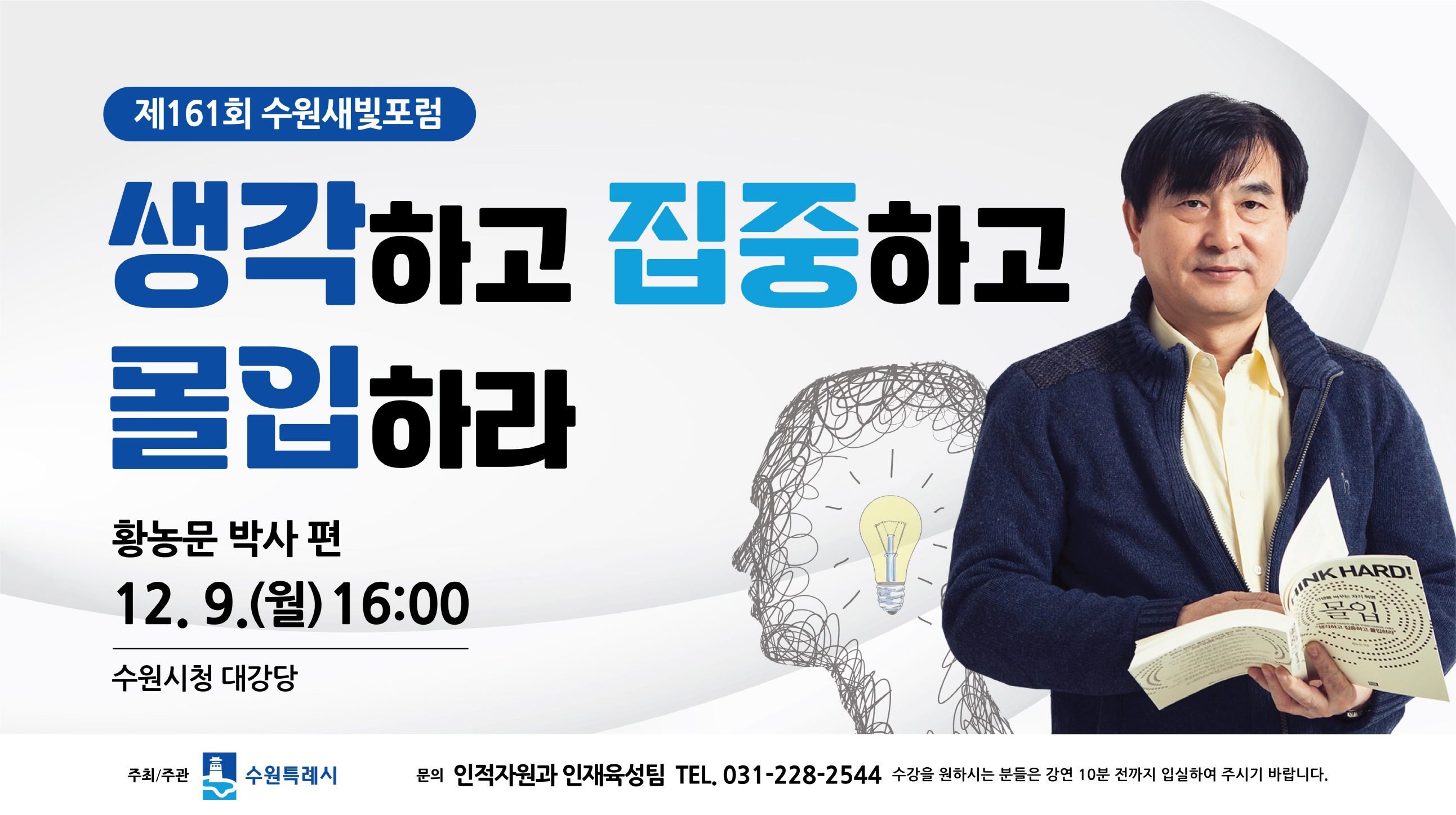 ‘몰입 전문가’ 황농문 몰입아카데미 대표가 12월 9일 오후 4시 시청 대강당에서 열리는 제161회 수원새빛포럼 강연자로 나선다. ‘생각하고 집중하고 몰입하라’를 주제로 강연하는 황농문 대표는 유튜브 쇼츠, 인스타 릴스 등 짧은 영상에 중독돼 전두엽이 손상된 현대인들이 ‘몰입’을 회복할 방법을 알려준다. 또 높은 업무 효율, 만족스러운 일상이라는 두 마리 토끼를 잡을 수 있는 ‘몰입적 삶’을 살아가는 방법을 제시한다. 황농문 대표는 서울대학교 금속공학과를 졸업하고, 카이스트 대학원 재료공학 석·박사 학위를 취득한 후 20여 년 동안 서울대학교 재료공학부 교수로 재직했다. 현재 몰입 전문가로 활동하고 있다. tvN ‘어쩌다 어른’ 등에 출연해 대중들에게 친숙하다. 저서로는 「몰입」, 「몰입 : 두 번째 이야기」, 「슬로싱킹」, 「공부하는 힘」 등이 있다. 수원새빛포럼은 누구나 참여할 수 있는 강연이다. 별도 신청 없이 포럼 당일 수원시청 별관 대강당을 찾으면 된다. 수원시 관계자는 “미국 심리학계 거장 중 한 사람인 칙센트미하이 교수는 ‘삶을 훌륭하게 가꿔주는 것은 행복감이 아니라 몰입’이라고 했고, 몰입으로 일과 놀이가 어우러지는 건강한 삶을 누릴 수 있다고 했다”며 “이번 수원새빛포럼은 몰입하는 방법을 배울 수 있는 좋은 기회가 될 것”이라고 말했다. 문의 : 031-228-2544, 수원시 인적자원과 |