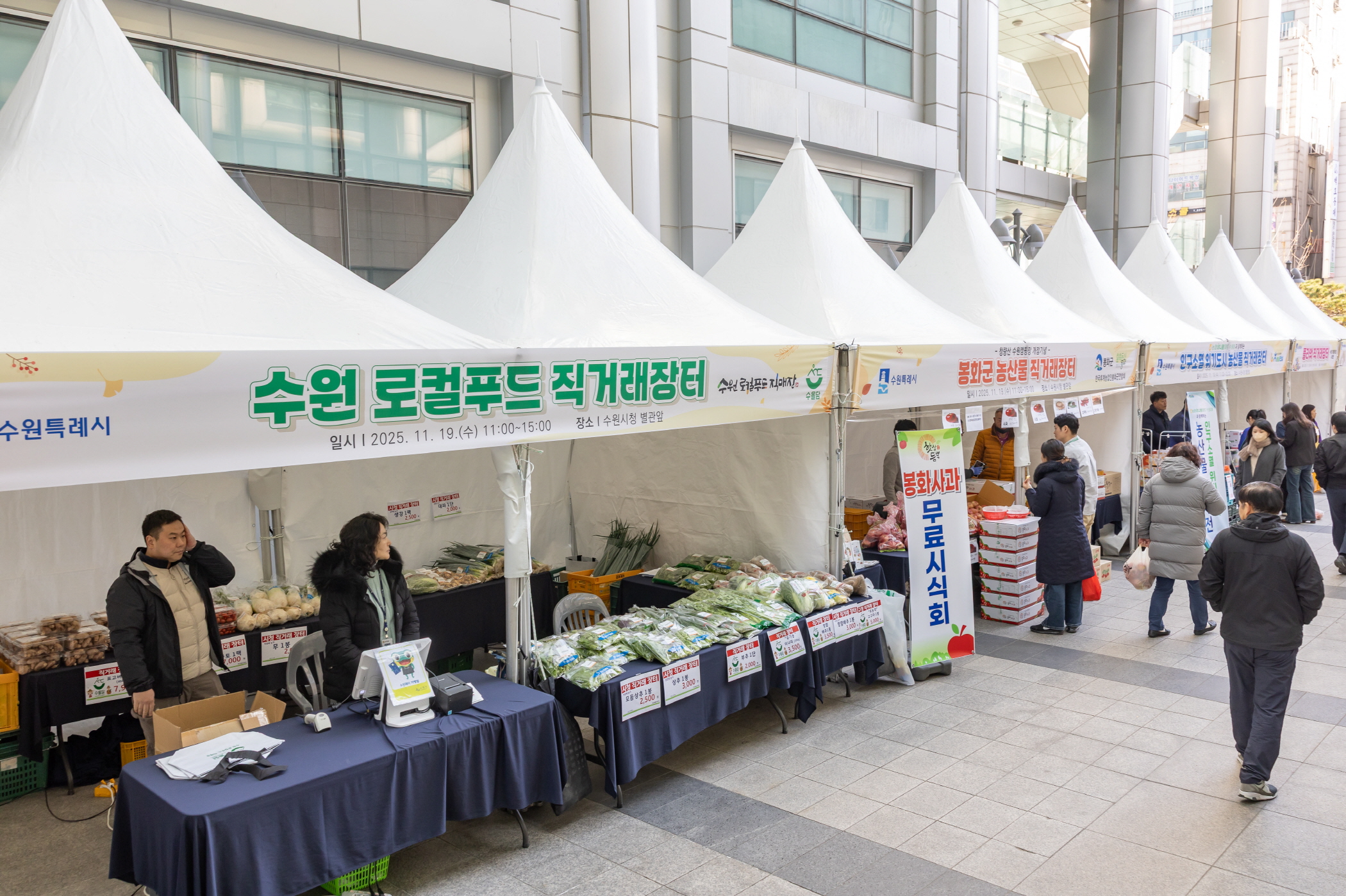 수원특례시(시장 이재준)와 봉화군농어업회의소는 19일 수원시청에서 로컬푸드 입점 협약을 체결했다. 협약식은 이날 시청 별관 앞에서 열린 ‘봉화 수원 캠핑장 개장 기념 농산물 직거래장터’에서 진행됐다. 수원시는 인구소멸 위기 지역 농가의 안정적 판로 확보를 지원하고, 시민에게 신선한 지역 농산물을 제공할 예정이다. 협약식에는 남상은 수원시 농업기술센터 소장, 김주익 봉화군농어업회의소 회장, 신종길 봉화군 농업기술센터 소장 등이 참석했다. 봉화 수원 캠핑장 개장 기념 농산물 직거래장터에는 수원시·봉화군·수원농협·하나로마트 수원점이 참여했다. 수원로컬푸드직매장은 상추·배추·표고버섯 등 농산물을, 봉화군은 사과·생강·고구마·마 등 주요 특산물을 판매했다. 하나로마트 수원점은 감, 인삼, 대추, 새우젓, 멸치 등 통영·사천·김천 등의 농산물을 판매했다. 방문객에게 정다미 500g 200개와 장바구니 200개를 제공하는 행사도 진행했다. 수원시 관계자는 “수원시민에게 신선한 로컬푸드를 제공하고, 인구소멸 위기 지역 농가와 상생 협력할 수 있는 기반을 마련했다”며 “지역 농가와 시민 모두에게 도움이 되는 직거래장터를 확대하겠다”고 말했다. |