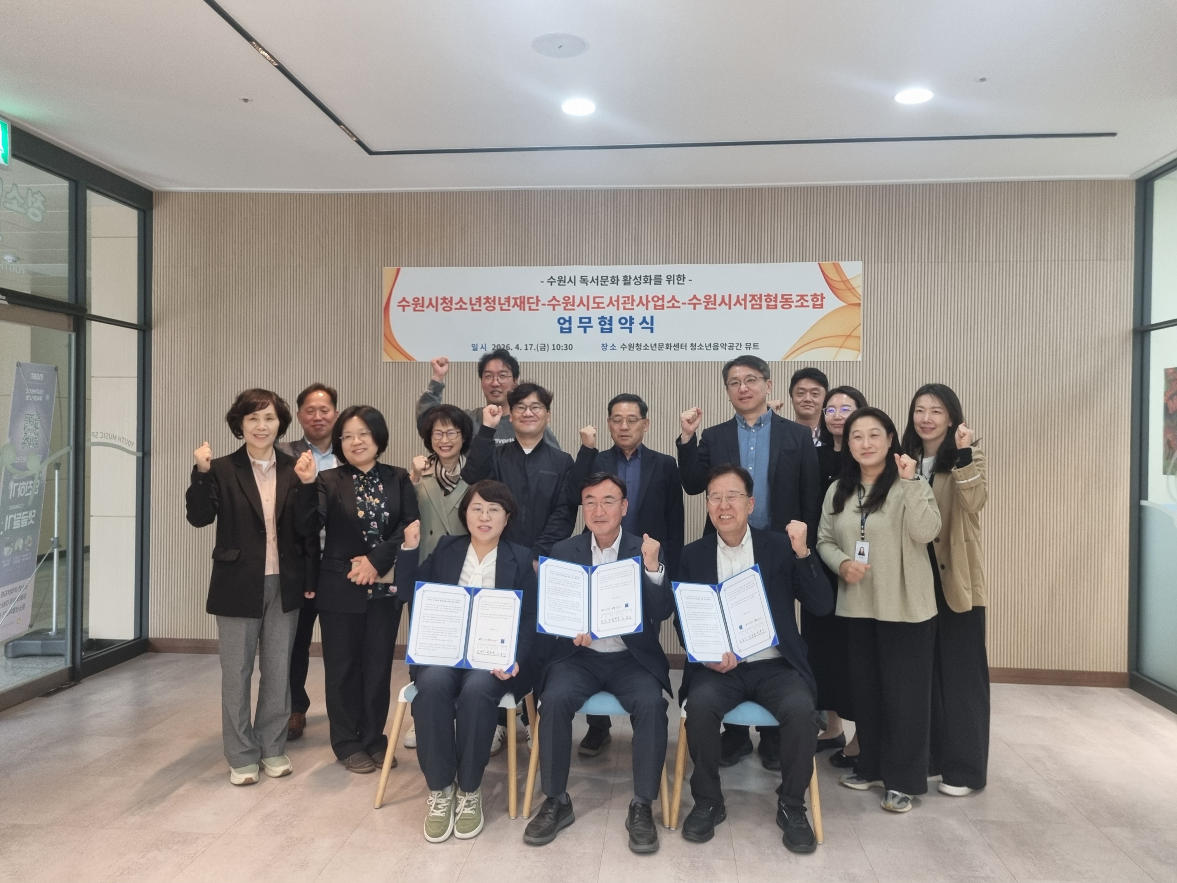 수원특례시, ‘독서도시 수원’ 위상 높인다… 관계 기관과 협력체계 구축 수원시도서관사업소, 청소년청년재단·서점협동조합과 독서문화 활성화 위한 업무협약 체결