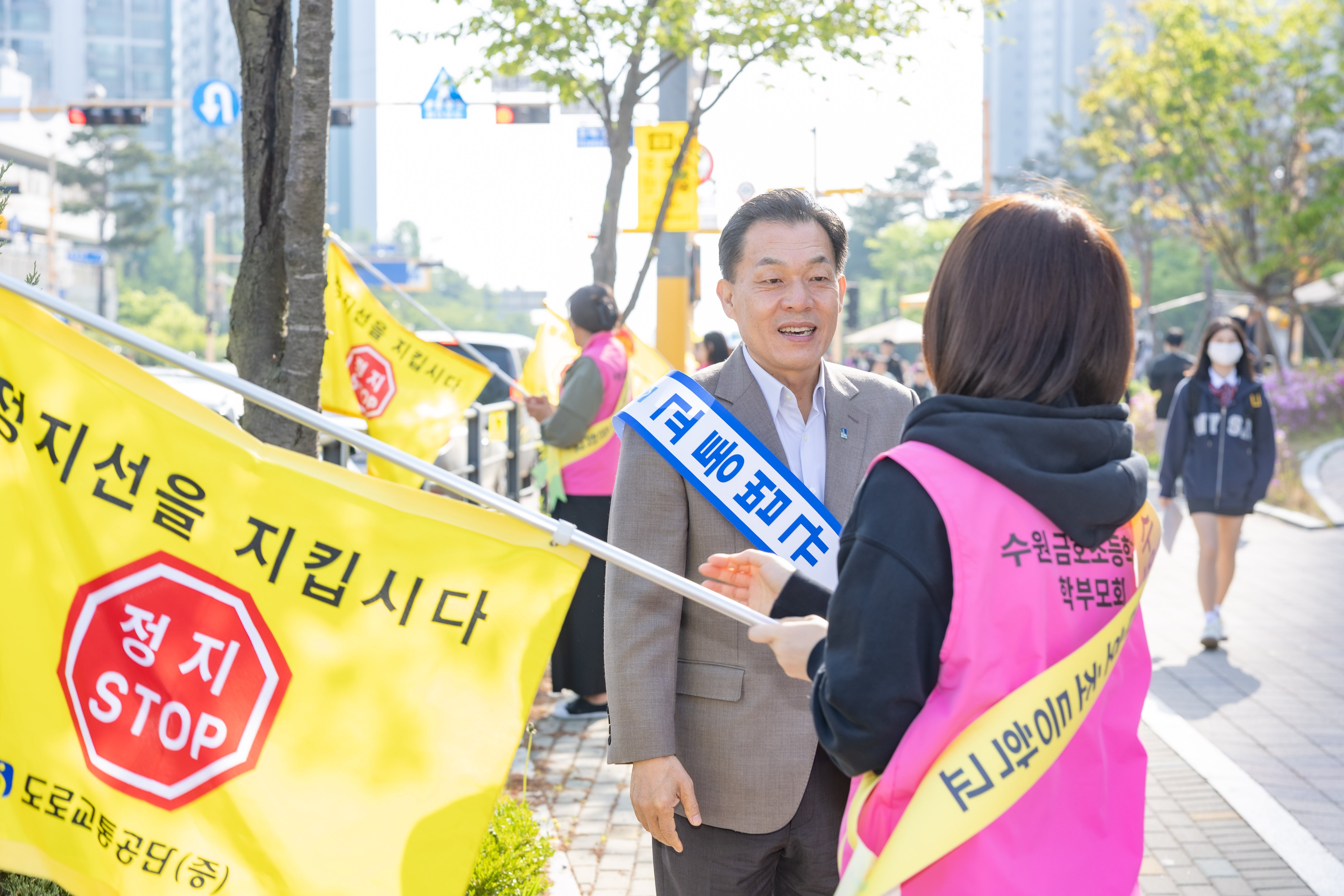 수원특례시, 3년 전 어린이보호구역 사망사고 났던 장소에서 교통안전 문화 정착 위한 민·관·경 합동캠페인 이재준 수원특례시장, 수원녹색어머니연합회, 모범운전자연합회, 삼운회, 수원권선경찰서, 호매실지구대, 금호초등학교 등 참여