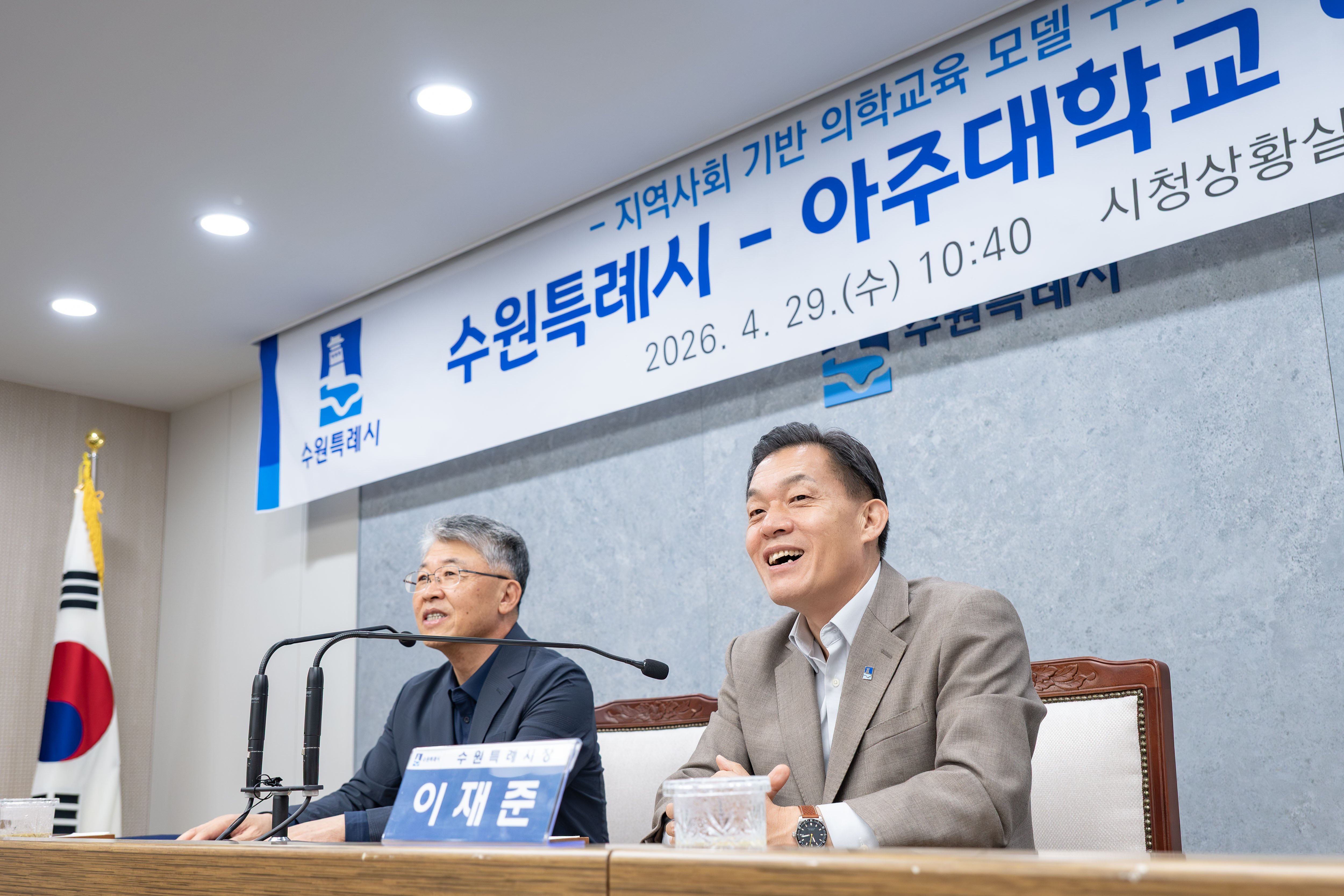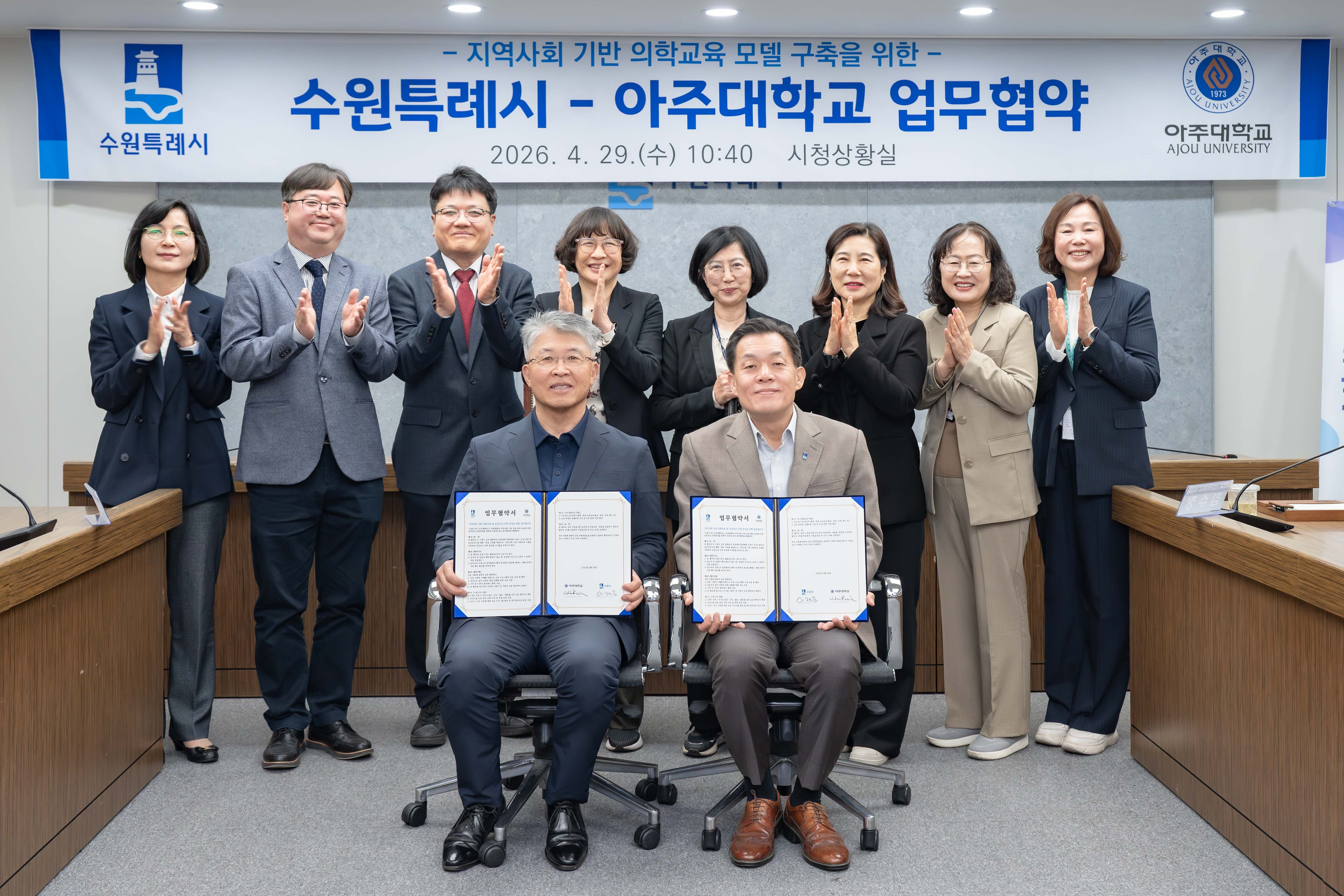 수원특례시와 아주대학교가 지역사회에 기반을 둔 새로운 의학교육 모델을 구축하고, 미래 지역 의료인 양성을 위해 힘을 모은다. 수원시와 아주대학교는 29일 시청 상황실에서 ‘지역사회 기반 의학교육 모델 구축을 위한 업무협약’을 체결하고 협력을 약속했다. 이날 협약식에는 이재준 수원특례시장, 최기주 아주대학교 총장, 4개 구 보건소장, 아주대학교 의과대학 학장 등이 참석했다. 협약에 따라 아주대학교 의과대학 5학년 학생들은 수원시 보건소에서 보건소별 특화교육을 이수하게 된다. 수원시는 예비 의료인들이 현장에서 시민의 삶을 마주하며 지역사회와 연계된 공공의료 체계를 입체적으로 경험할 수 있도록 교육 환경을 지원한다. 주요 협력 사항은 ▲지역사회 기반 의학교육 모델 공동 개발·운영 ▲보건소별 특화 교육 프로그램 개발, 현장 실습 지원 ▲지역사회 보건 발전을 위한 정보 공유, 인적 교류 등이다. 이재준 수원특례시장은 “이번 협약으로 예비 의사들이 시민과 가장 가까이 있는 보건소 현장에서 경험을 쌓게 된다”며 “현장에서 시민의 삶을 마주하는 경험은 의료의 본질과 가치를 되새기는 기회가 될 것”이라고 말했다. 이어 “지역과 의료를 잇고, 미래의 지역 의료인을 키워낼 마중물이 될 의학교육 모델을 제시해 주신 아주대학교에 감사드린다”며 “예비 의료인들이 보건소에서 의미 있는 경험을 쌓고 성장하도록 교육을 준비할 것”이라고 밝혔다. |
