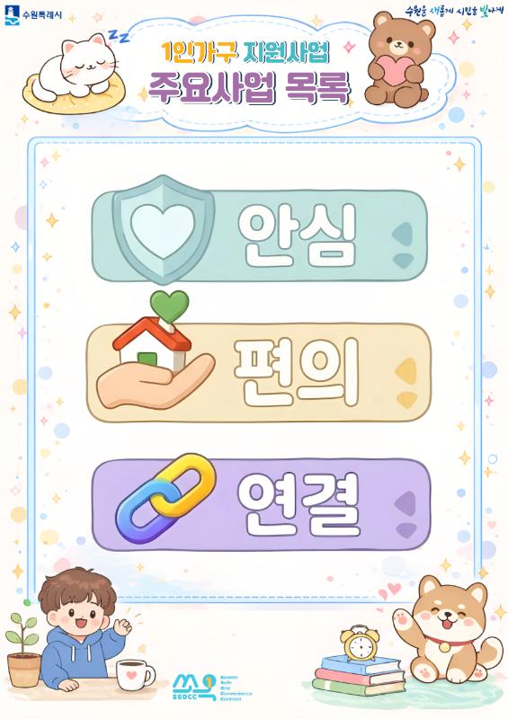 주요 사업 목록 홈 사업안내 주요 사업 목록 게시물 검색 제목 내용 제목+내용 검색 총 1건 [ 1/1 페이지 ] 1인가구 부서 주요사업 목록 2026/03/05 조회 : 22 1 콘텐츠 만족도 조사 이 페이지에서 제공하는 정보에 대하여 어느 정도 만족하셨습니까? 만족도 조사 매우만족 만족 보통 불만족 매우불만족 담당자 정보 담당자 정보 담당부서 가족정책과전화번호 031-5191-2219
