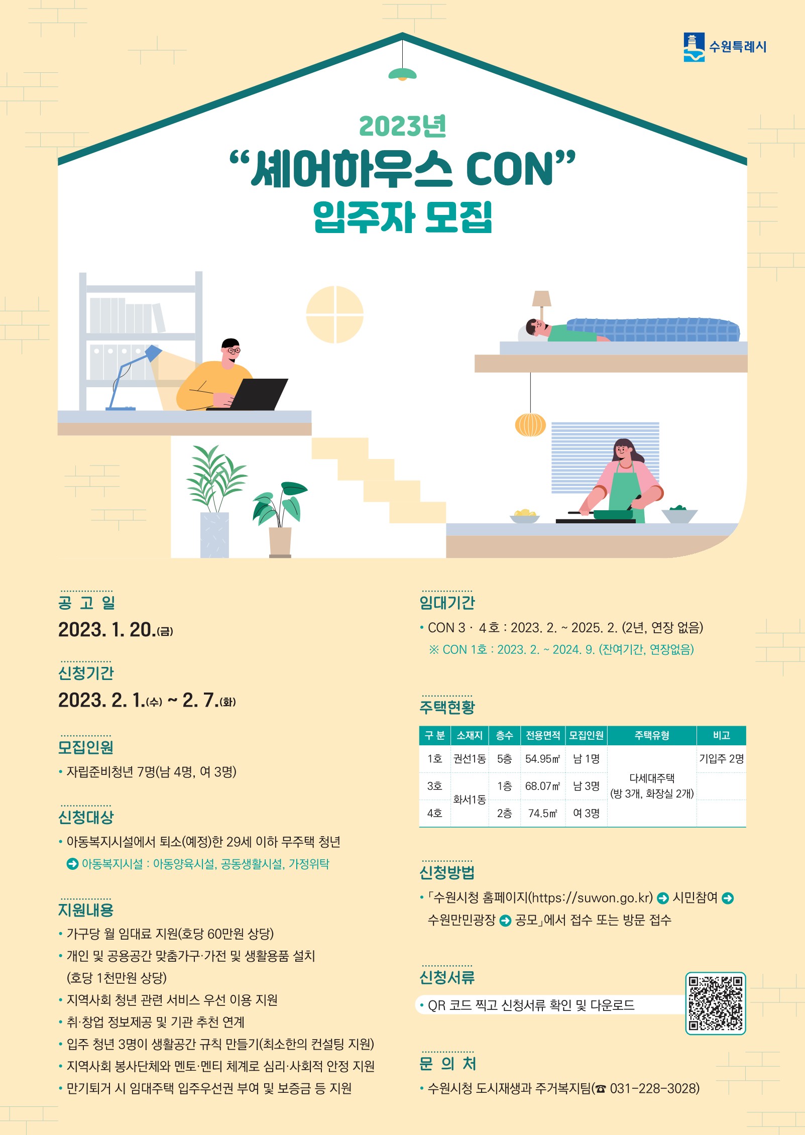 수원시는 자립준비청년의 성공적인 자립을 지원하기 위해 “셰어하우스 CON”을 운영합니다. 아동복지시설에서 만기 또는 중도 퇴소(예정)한 청년들에게 임차료 없이 2년간 안정적으로 생활할 수 있는 주거공간을 제공하고 자립활동을 지원하면서 청년들이 함께 미래를 준비하는 행복한 독립공간이 되어주고자 아래와 같이 입주자(7명)를 모집하오니 많은 신청 바랍니다. ○ 신청기간 : 2023. 2. 1.(수) ~ 2. 7.(화) 18:00 마감 ○ 신청대상 : 모집 공고일(2023. 1. 20.) 현재 무주택자로서 아동복지시설 만기 또는 중도 퇴소(예정)한 29세 이하 청년 ▶ 아동복지시설 : 아동양육시설, 공동생활시설, 가정위탁 ○ 모집인원 : 자립준비청년 7명(남 4명, 여 3명) ○ 신청방법 : 수원시청 홈페이지 또는 방문 또는 이메일 - 홈페이지 접수 : 수원시청 홈페이지 → 시민참여 → 수원만민광장 → 공모 → '참여하기' - 방문접수 : 수원시청 도시재생과 주거복지팀 ○ 메일주소 : SUBIN0531@KOREA.KR ○ 문의전화 : 수원시 도시재생과 주거복지팀(☎ 031-228-3028) 붙임 2023 '셰어하우스 CON' 입주자 모집 공고문 |
