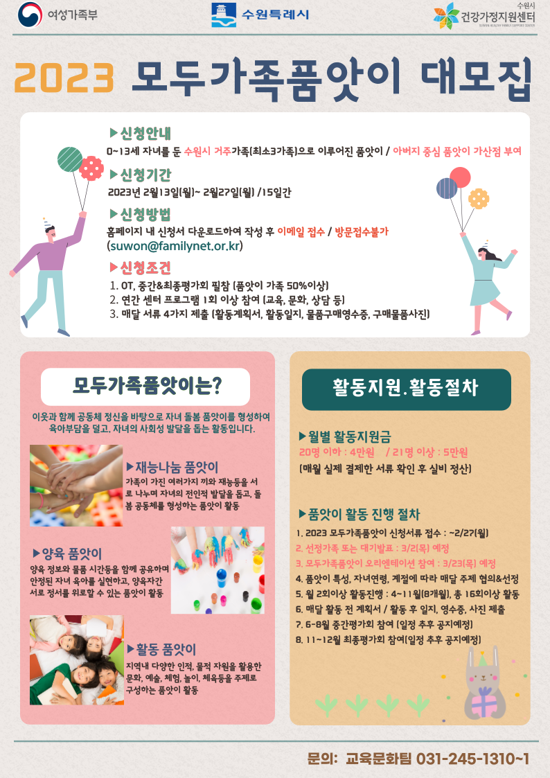 1) 사 업 명 : 2023년 모두가족품앗이 - '함께 성장하는 우리 아이들' 2) 신청기간 : 2023. 02. 13(월) ~ 02. 27(월) 3) 신청방법 : 수원시건강가정지원센터 홈페이지 신청서 작성 후 메일 발송 (suwon@familynet.or.kr) 4) 대 상 : 0~13세 자녀를 둔 수원시 거주 가족 품앗이 (최소 3가족 1품 형성) 5) 사업기간 : 2023년 4월~11월, 8개월간, 월 2회 이상 6) 사업내용 : 육아 스트레스 경감, 양육 공백 최소화, 자녀 사회성 발달을 위한 수원시 지역가족 돌봄공동체 형성 및 활동을 지원 7) 활동지원 : 20명 이하 월 4만원, 21명 이상 월 5만원 품앗이 활동 지원금 지급 (실비 청구) 8) 문 의 : 031)245-1310 교육문화팀 민수정 |
