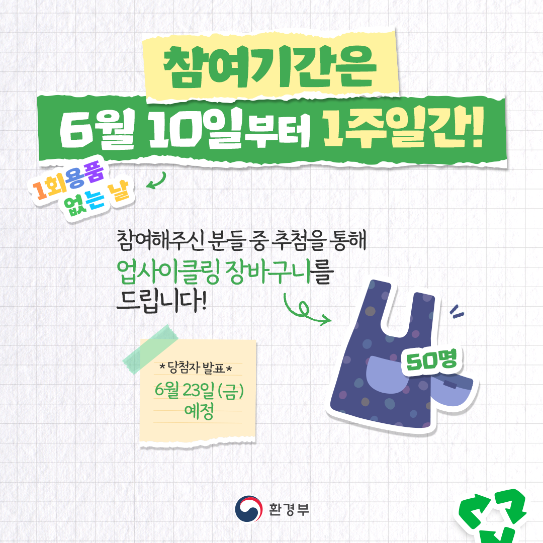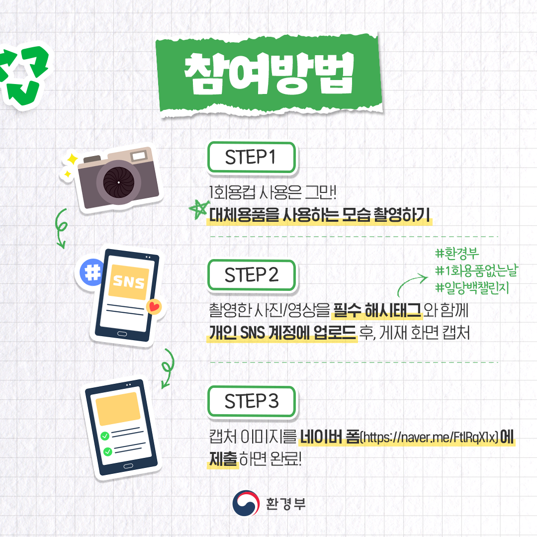 ○ 챌린지명 : 일당백 챌린지 ( 챌린지, 일회용품 줄인 당신이 백점) ○ 참여대상 : 일회용품 줄이기에 참여하는 사람, 누구나 ○ 진행절차 : 주제* 발표(매월 8일) → 일회용품 줄이기 실천 및 인증참여(10∼16일) → 당첨자 발표(23일) * 매월 주제를 선정하여 정기적으로 진행(~12월) ○ 참여방법 ① 매월 주제인 ‘일회용품을 쓰지 않는 모습’ 촬영(사진 또는 영상) ② 촬영 사진/영상을 해시태그*와 함께 개인 사회관계망서비스(SNS)에 게재 * #일당백챌린지, #1회용품없는날, #환경부 ③ 게재 화면 이미지를 네이버폼에 접수 |