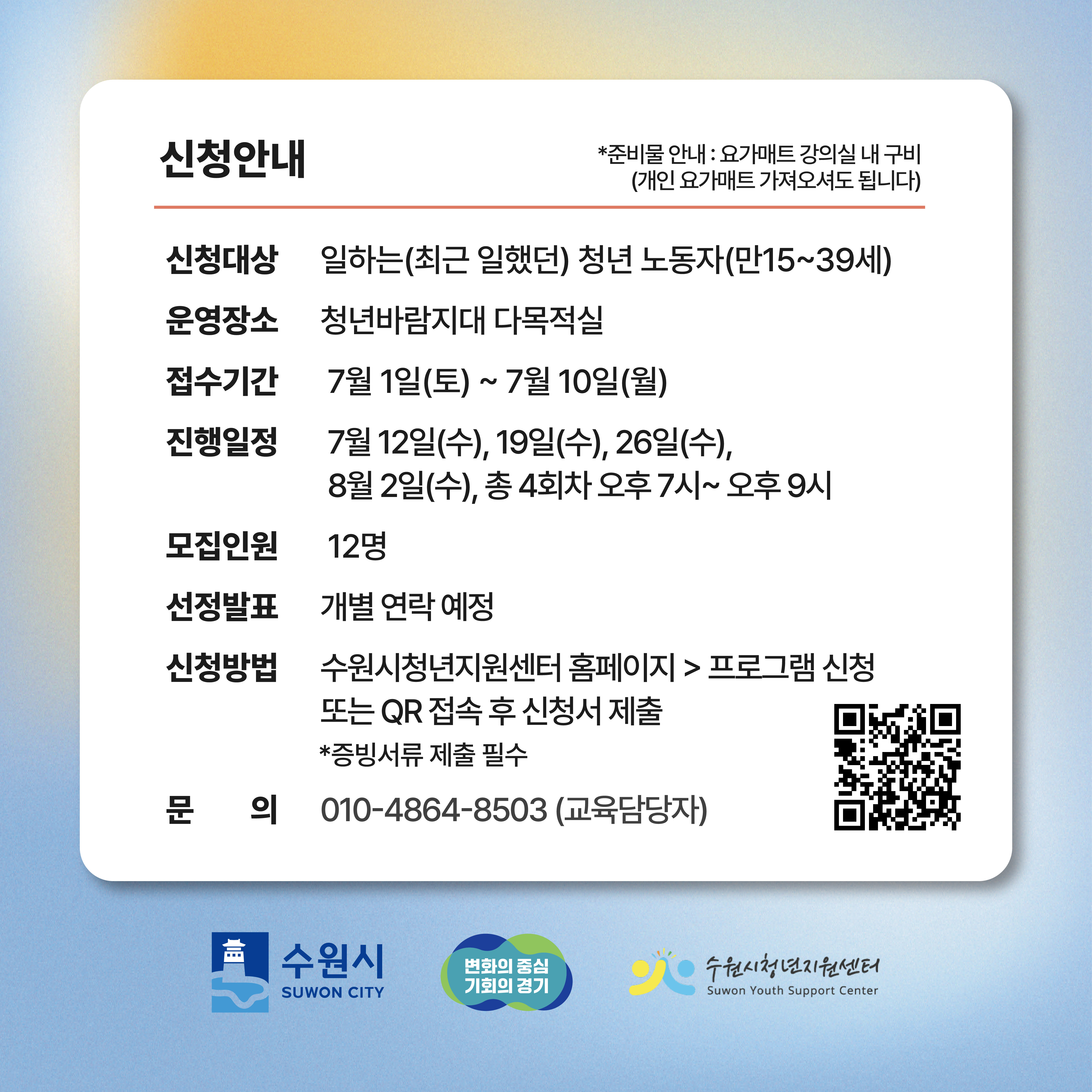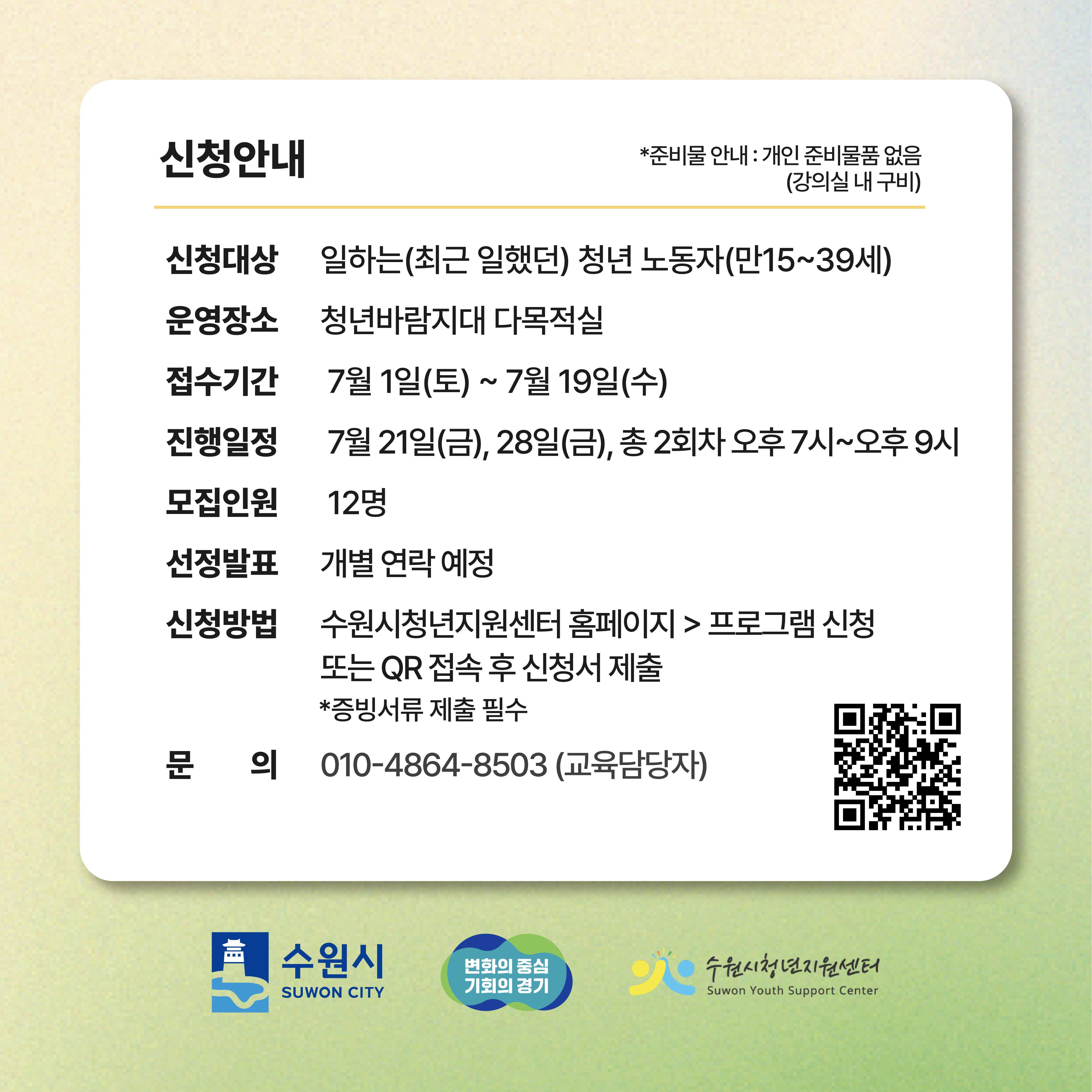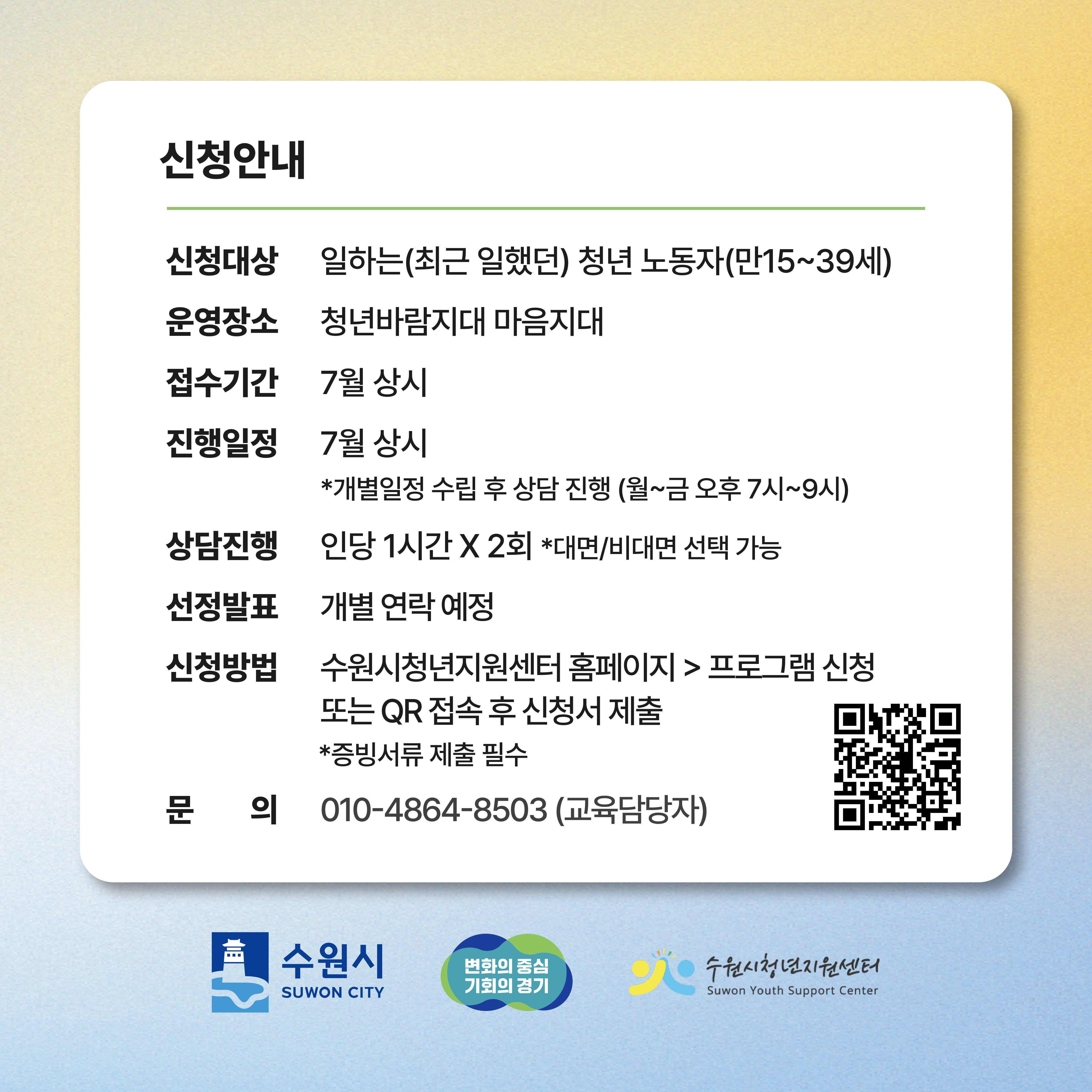 일에 지친, 대인관계로 힘든 일하는 청년을 위한 스트레스 관리 및 여가지원 프로그램을 운영합니다. 스트레스 진단과 해결방법이 알고 싶은, 고민에 대해 누군가와 소통하고 싶은, 색다른 취미활동을 하고 싶은 청년분들, 청년지원센터로 오세요~ <청년 노동자 심리치유 프로그램> - 기 간 : 2023. 7. ~ 12. - 장 소 : 청년바람지대, 청누리 - 대 상 : 일하는(최근 일했던) 청년 노동자(만15~39세) * 회사원, 아르바이트, 프리랜서, 사업자 등 근로형태 상관없이 가능 - 신청방법 : 수원시청년지원센터 홈페이지 > 프로그램 신청 또는 붙임 카드뉴스 QR 접속 - 운영내용 (1) 소곤소곤 고민상담 - 모집기간 : 7월 상시 - 진행일정 : 7월 상시(개별일정 수립후 상담진행 / 월~금 19:00~21:00 선택) - 운영장소 : 청년바람지대 마음지대(팔달구 효원로249번길 38 2층) *희망시 비대면 가능 - 상담진행 : 1인 2회(1회 1시간) - 내 용 : 사전 스트레스 진단 검사 후 1:1 전문가 상담 (2) 토닥토닥 힐링특강 - 모집기간 : 7. 1.(토) ~ 7. 19.(수) - 운영일시 : 7. 22.(토) 13:00~15:00 - 장 소 : 청누리(팔달구 행궁로 68-1) - 모집인원 : 20명 - 내 용 : '소통방식' 에 대한 주제 특강 및 소그룹 활동 (3) 이너피스 힐링명상 - 모집기간 : 7. 1.(토) ~ 7. 10.(월) - 운영일시 : 7. 12.(수) ~ 8. 2.(수) 매주 수요일 19:00~21:00 / 총4회 - 장 소 : 청년바람지대 3층 다목적실 - 모집인원 : 12명 - 내 용 : 스트레스 집중 치유 명상 및 기초요가 * 강의실 내 요가매트 구비(개인 요가매트 가져오셔도 됩니다) (4) 쉬엄쉬엄 취미생활 - 모집기간 : 7. 1.(토) ~ 7. 19.(수) - 운영일시 : 7. 21.(금), 7. 28.(금) 19:00~21:00 / 총2회 - 장 소 : 청년바람지대 3층 다목적실 - 모집인원 : 12명 - 내 용 : 1회차-그린테라피(나의 반려식물 키우기) * 강의실 내 준비물품 구비(개인 준비물 없음) * 증빙서류 필요 : 일하고 있거나 최근 일했음이 확인되는 일체 서류 (근로확인서, 재직증명서, 소득금액증명원, 건강보험자격득실 확인서, 고용보험자격이력확인서, 사업자등록증(창업청년)) * 문의 : 010-4864-8503(교육담당자) / 031-228-3960(수원시 청년청소년과) ![]() |