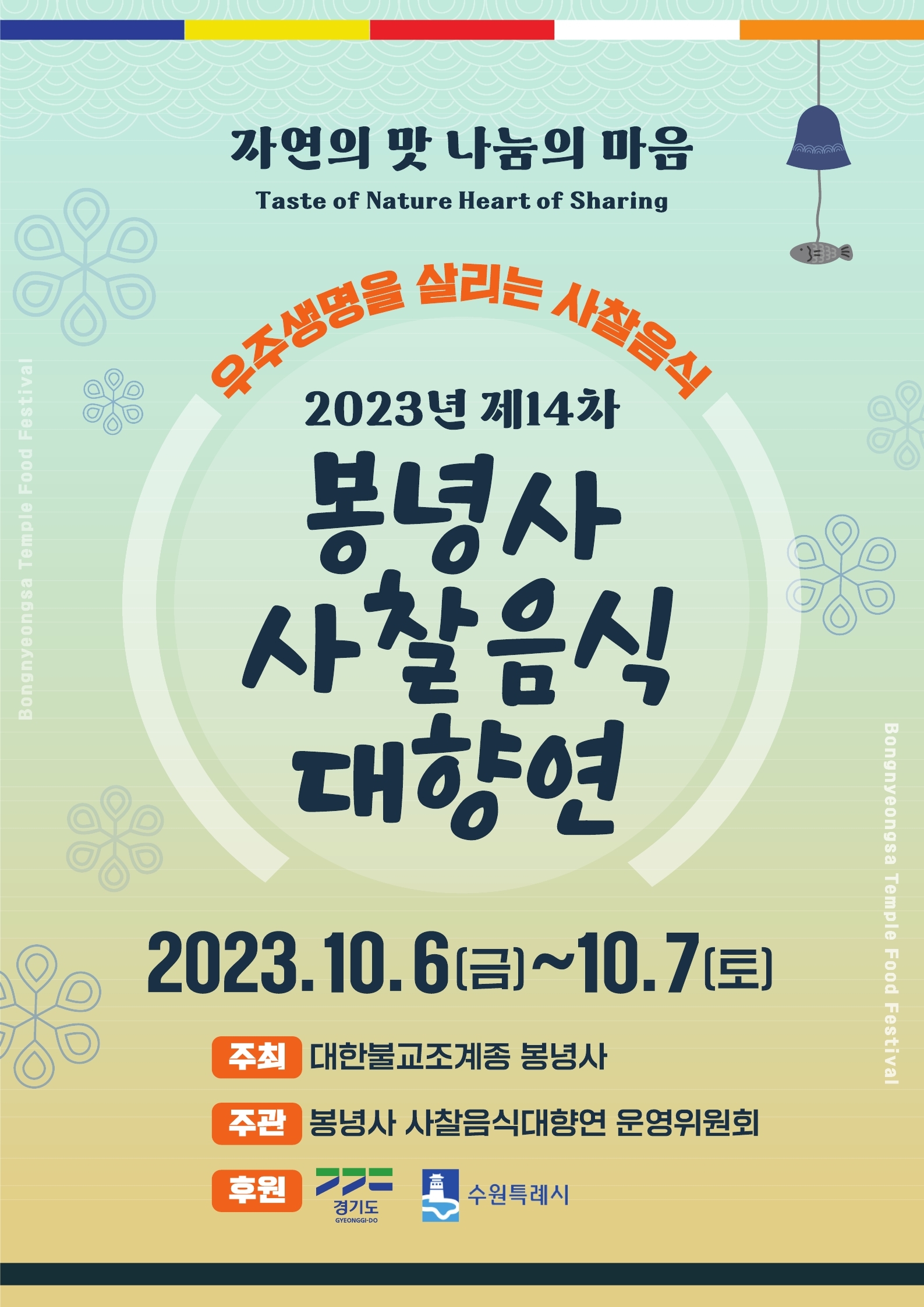 전통 사찰음식의 진수를 만날 수 있는 '2023년 제14차 봉녕사 사찰음식 대향연'이 개최됩니다. 올해는 '우주생명을 살리는 사찰음식'을 주제로 전세계적 화두인 환경문제를 함께 고민하고, 이를 극복하는 데 기여할 사찰음식의 친환경적 가치를 되새기는 자리로 마련되었습니다. 시민 여러분의 많은 참여 바랍니다. ○ 일 시 : 2023. 10. 6.(금) ~ 10. 7.(토) [2일간] ○ 장 소 : 봉녕사 경내(팔달구 창룡대로 236-54) ○ 주 최 : 대한불교조계종 봉녕사 ○ 주 관 : 봉녕사 사찰음식대향연 운영위원회 ○ 후 원 : 경기도, 수원시 ○ 주요내용 · 사찰음식경연대회 전시 및 평가 · 차명상, 육법공양, 탁발순례 시연 · 사찰음식 실습강좌 및 특강 · 조선마술패, 우담화합창단 공연 |