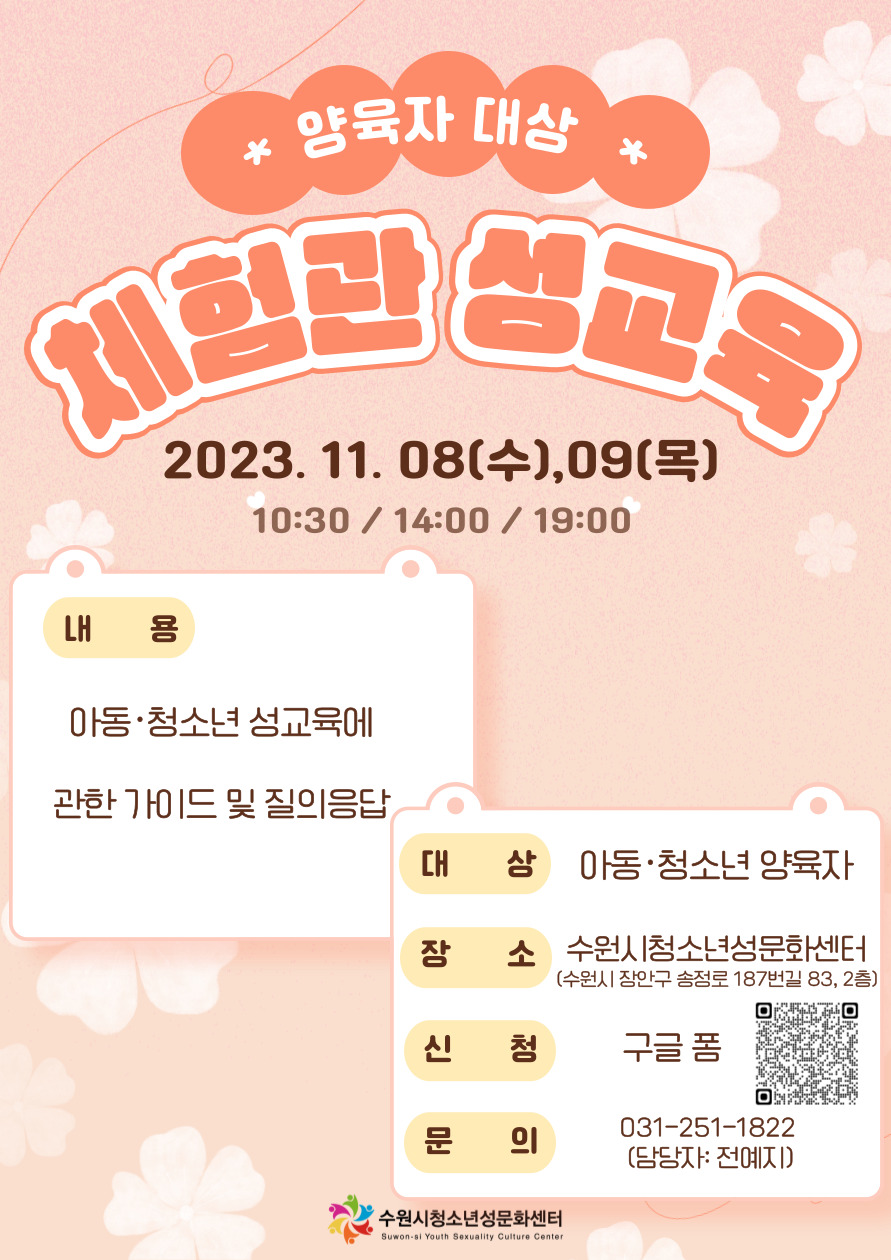 <수원시청소년성문화센터 양육자 성교육> ○ 날 짜: 2023.11.08(수), 09(목) 10:30 / 14:00 / 19:00 ○ 대 상: 아동· 청소년 성교육이 궁금한 양육자 ○ 장 소: 수원시청소년성문화센터 (수원시 장안구 송정로 187번길 83, 2층) ○ 내 용: 아동· 청소년 성교육에 관한 가이드 및 질의응답 ○ 신청방법: 구글폼https://docs.google.com/forms/d/1ybjTk1NAUOQPwm9uOtckE4URN2cYuV9pRNGxenwbaDw/edit?usp=forms_home&ths=true ○ 문 의: 수원시청소년성문화센터(031-251-1590/1822), 담당자: 전예지 |