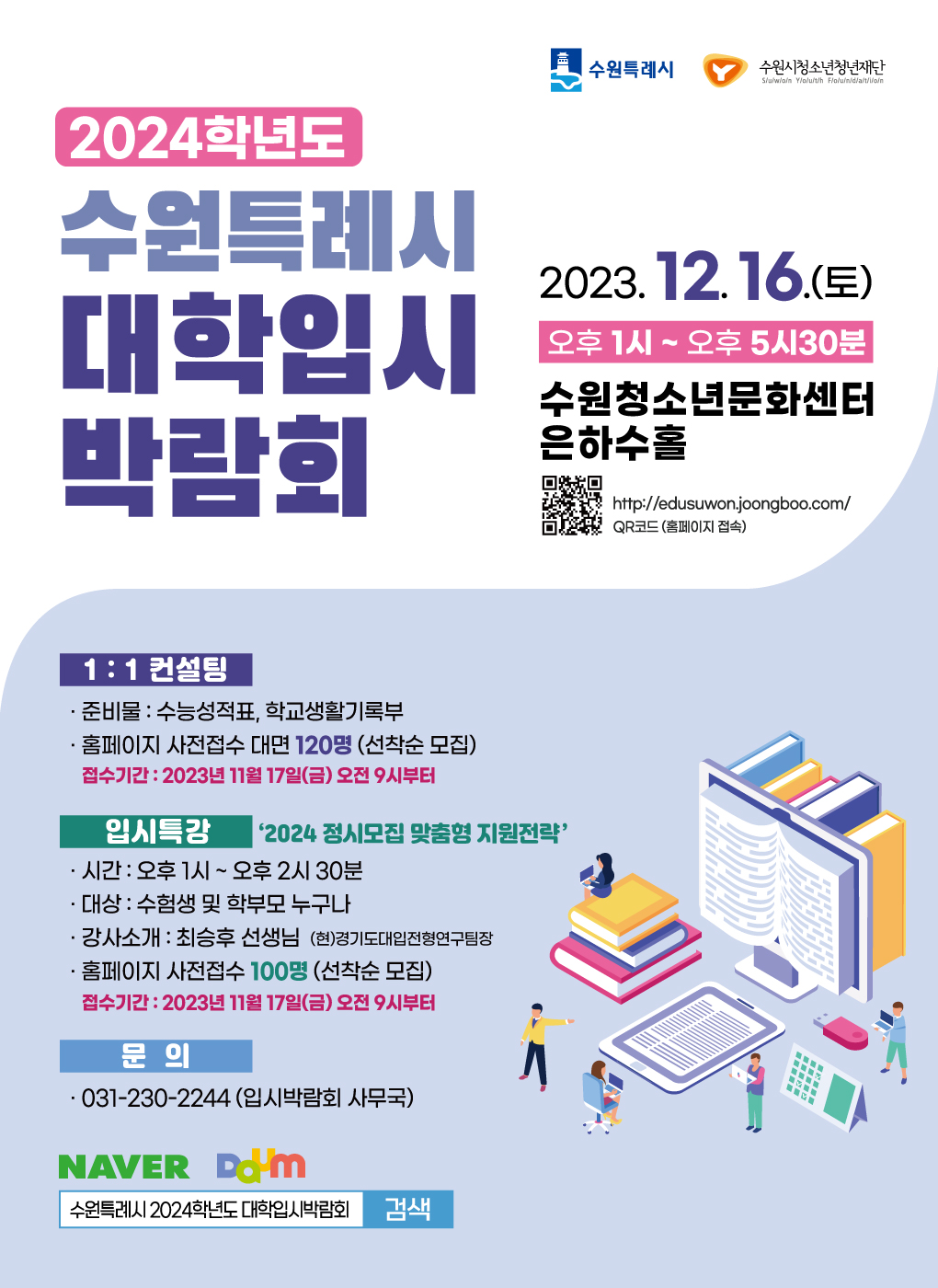 「수원특례시 2024학년도 대학입시박람회(정시전형) 개최」 2024학년도 대학수학능력시험이 얼마 남지 않았습니다.하나의 목표를 위해 성실하게 달려온 여러분들의 도전에 큰 박수를 보내며,모든 수험생분들의 꿈을 진심으로 응원합니다!수능 이후 대학에 대한 고민을 조금이라도 덜어드리고자정시전형 대비 '수원특례시 2024학년도 대학입시박람회'를 개최합니다.개인별 맞춤 진학상담 시간(1인 40분)이 확대되었으며, 최승후 선생님의 특강도 준비되어 있으니많은 참여로 대학 진학에 도움이 되셨으면 좋겠습니다 :) [개최 개요] ○ 일 시 : 2023. 12. 16.(토) 13:00 ~ 17:30 ○ 장 소 : 수원청소년문화센터 은하수홀 ○ 대 상 : 수원특례시 관내 고3 수험생 및 학부모 [세부내용] ○ 1:1 컨설팅 - 일시 : 2023. 12. 16.(토) 13:00 ~ 17:30 - 접수: 2023. 11. 17.(금) 오전 9시 ~ 선착순 마감 ※ 당일 불참자 발생 시 현장 참여 가능 ○ 입시특강 '2024 정시모집 맞춤형 지원전략' - 일시 : 2023. 12. 16.(토) 13:00 ~ 14:30 - 강사 : 최승후 선생님 현) 경기도대입전형연구팀장 - 접수: 2023. 11. 17.(금) 오전 9시 ~ 선착순 마감 ※ 당일 불참자 발생 시 현장 참여 가능 ★대학입시박람회 홈페이지 오픈일 : 2023. 11. 11.(토) ☞ 포털 검색(홈페이지) : 수원특례시 2024학년도 대학입시박람회 (2024학년도 대학입시박람회 홈페이지 바로가기) |