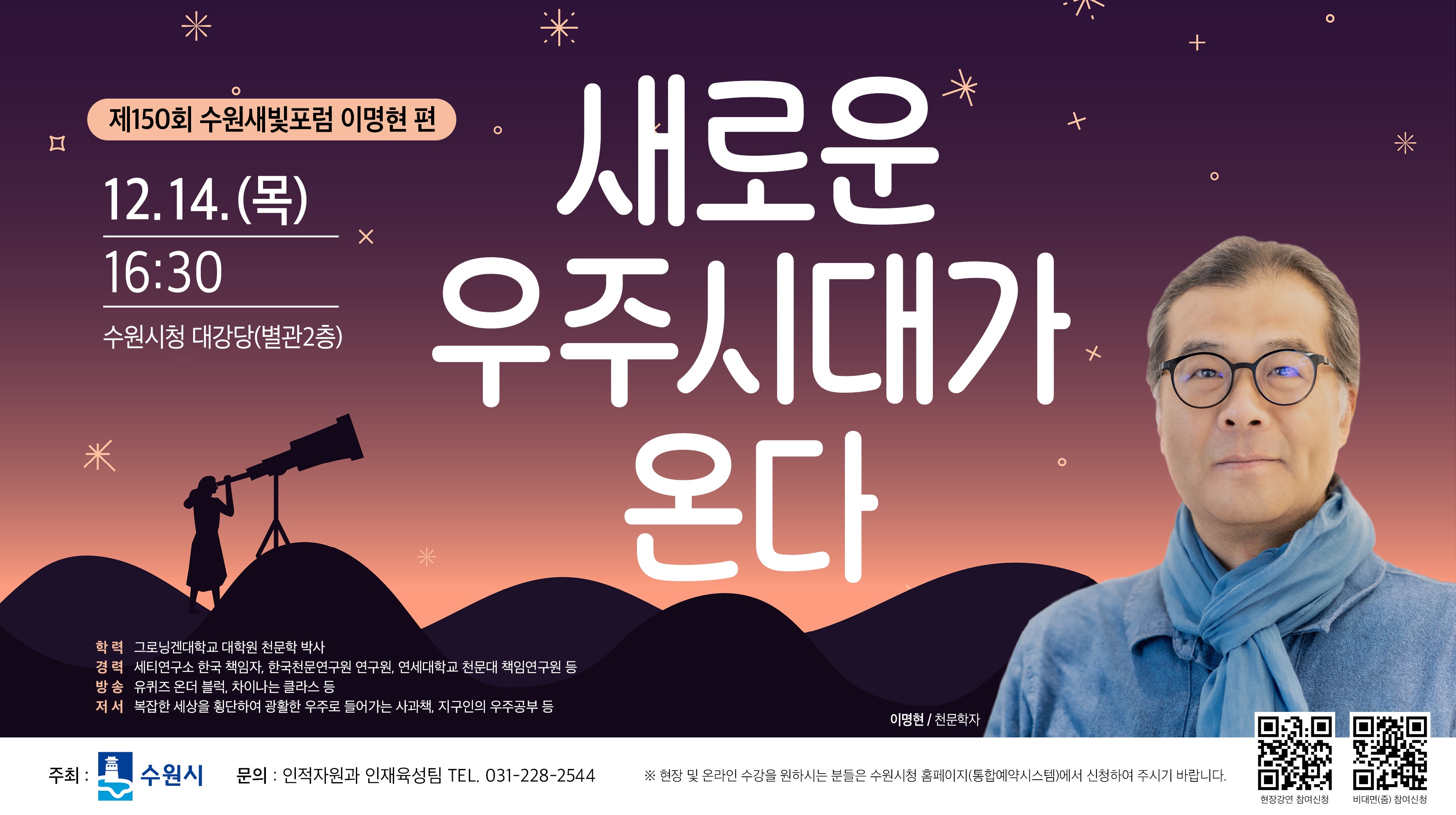 ❍ 일 시 : 2023. 12. 14.(목) 16:30 ~ 18:00 [90분간] ❍ 장 소 : 시청 대강당 및 줌 ❍ 초청강사 : 천문학자 이명현 박사 ❍ 강연주제 : 새로운 우주시대가 온다. ❍ 참여대상 : 시 소속 공직자 및 공무직, 참여를 원하는 시민 누구나 ❍ 진행방법 : 집합 및 실시간 온라인 송출(줌) 병행 ❍ 참여신청 : 수원시청 홈페이지(통합예약시스템) 신청 (현장강연신청) https://url.kr/xrw4jy (비대면 줌 신청) https://url.kr/v5ctsk 또는 인적자원과 유선 신청(031-228-2544) 수원새빛포럼은 무료로 진행되는 명사 초청 특강입니다. 시민 여러분의 많은 참여 바랍니다. ※수원새빛포럼 일정 게시 : https://www.suwon.go.kr/web/suwonforum/BD_view.do?seqNo=145&forumYear=2023 ※수원새빛포럼 홍보 영상 : https://www.youtube.com/watch?v=yeAm2Mr676A |