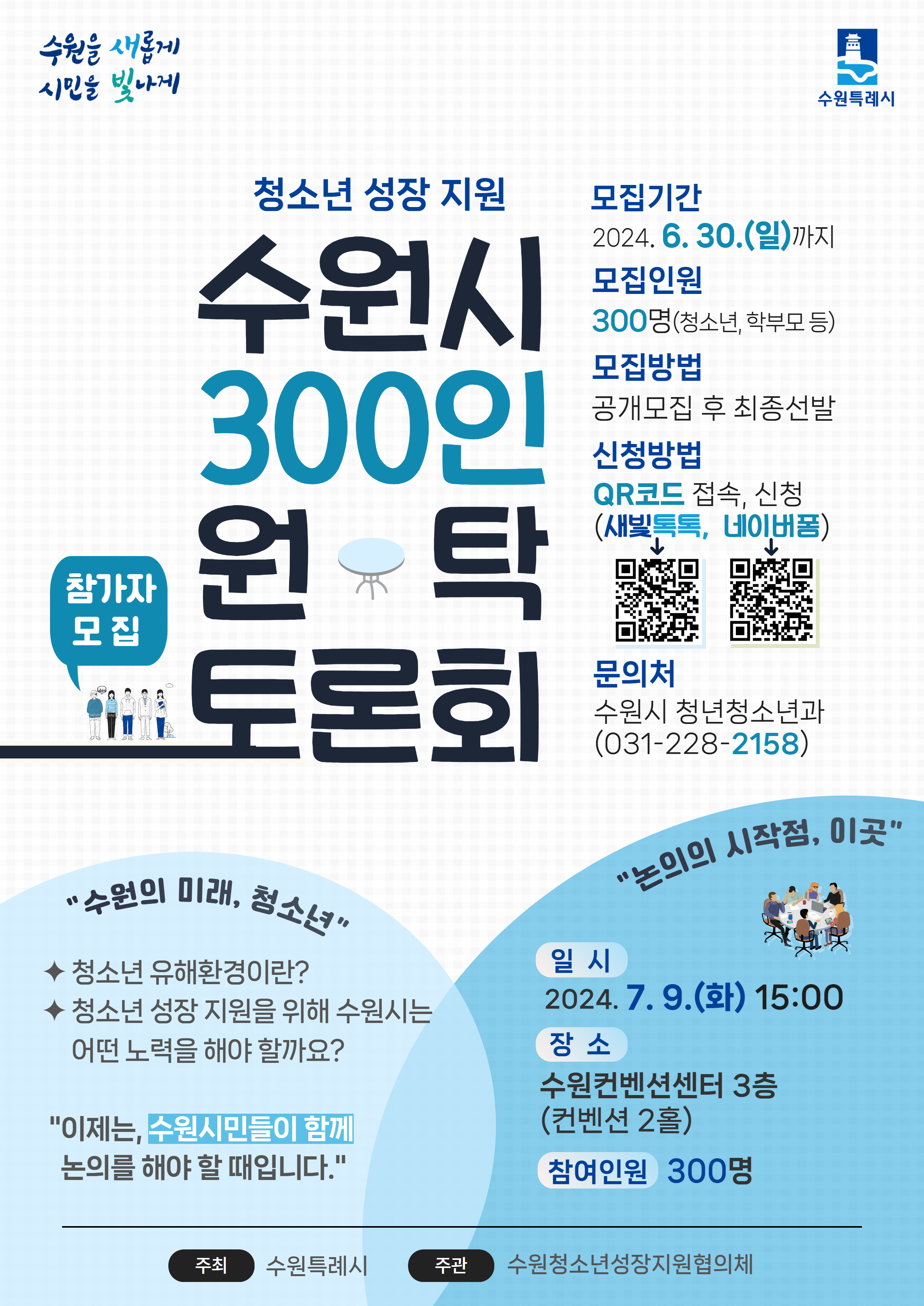 청소년과 시민들의 생각과 의견을 모아 “청소년이 행복한 도시 수원”을 만들어 가고자 “청소년 성장지원 300인 원탁토론회”를 아래와 같이 개최하고자 하오니, 관심있는 시민 여러분의 많은 관심과 참여 바랍니다. 1. 모집기간 : 2024. 6. 20.(목) ~ 6. 30.(일) ※ 원탁토론회 개최 : 2024. 7. 9.(화) 15시 / 수원컨벤션센터 컨벤션2홀(3층) 2. 모집대상 : 청소년 정책에 관심있는 수원시민 누구나(300명) ※ 단 청소년의 경우 중학생 이상 신청 가능 3. 신청방법 : QR코드 접속‧신청(새빛톡톡, 네이버 폼) ※ QR코드(포스터 참고)