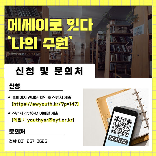 수원시청년지원센터에서 '에세이로 잇다(가을편-나의 수원)' 참여자를 모집하오니, 많은 참여 바랍니다. ○ 모집기간 : 2024. 8. 14.(수) ~ 8. 31.(토)까지 ○ 운영기간 : 2024. 9. 4.(토) ~ 10. 19.(토) 매주 토요일(총 7회) ○ 모집인원 : 10명 ○ 대 상 : 수원시 거주 또는 활동 처년(19~39세) ○ 주요내용 : 에세이 집필교육, 에세이 출간, 에세이를 통한 교류 활동(세부내용 첨부된 카드뉴스 참조) ○ 신청방법 : 신청서 서식(첨부파일) 작성 후 이메일 제출 ☞ youthyar@syf.or.kr 기타 상세내용 청년지원센터 홈페이지(https://swyouth.kr) 참조 바랍니다.