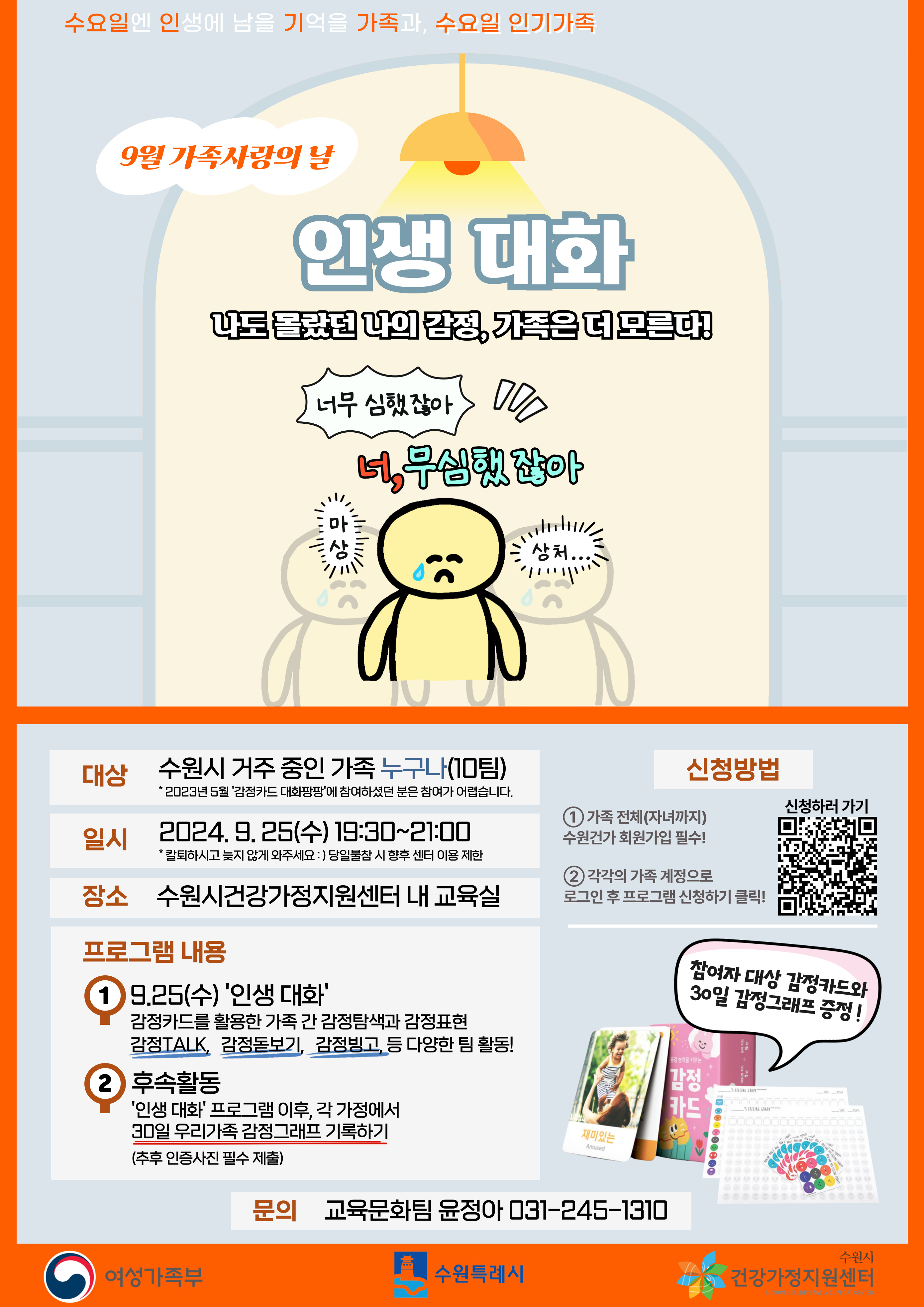 ○ 사 업 명: 9월 가족사랑의 날 - 인생대화 ○ 모집기간 : 2024.9.2(월) 9시부터 ~ 모집 시까지 ○ 일시 : 2024/9/25(수) 19:30~21:00 ○ 대상 : 수원시 거주 가족이라면 누구나 (2인 이상, 10팀 모집) ○ 내용 : 감정카드를 활용한 가족 간 감정탐색과 감정표현 기술 증진 ○ 장소 : 수원시건강가정지원센터 내 교육실 (경기 수원시 팔달구 향교로161, 우림빌딩 6층) ○ 참 가 비 : 무료 |