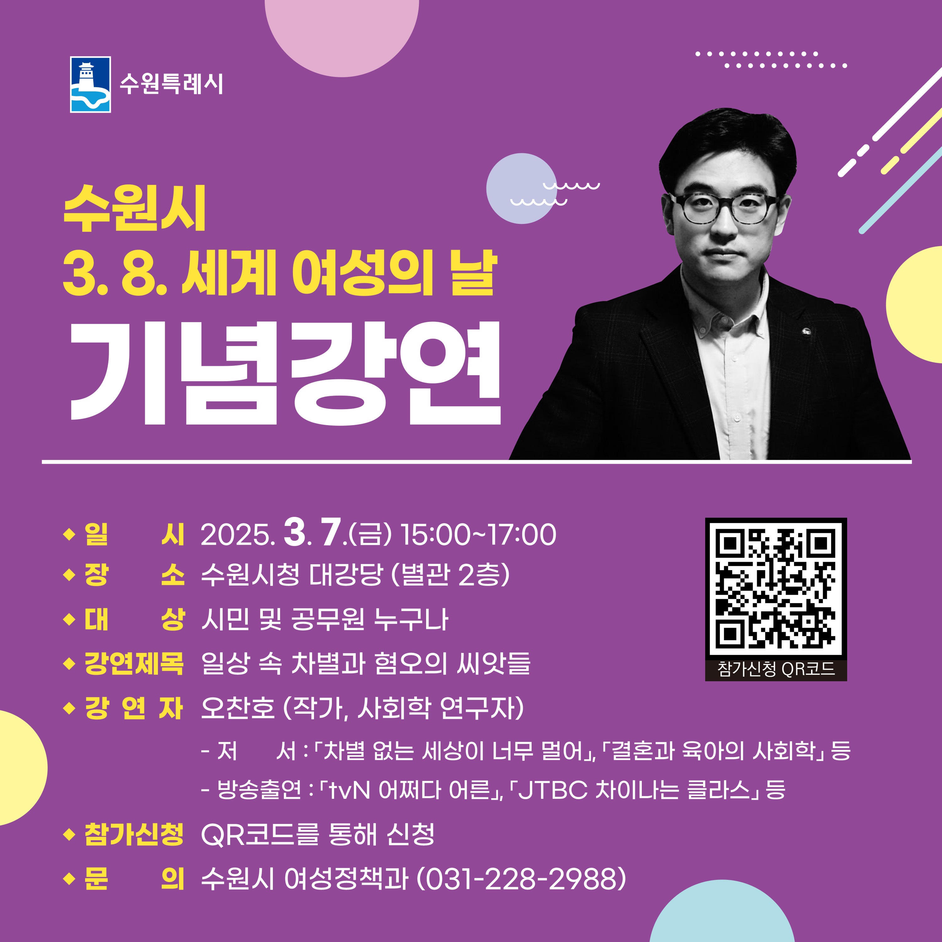 수원시에서 '3. 8. 세계'을 맞아 시민과 공무원 누구나 참여할 수 있는 기념 강연을 마련하였으니 꼭 함께해 주시기 바랍니다. ○ 일 시 : 2025. 3. 7.(금) 15:00~17:00 ○ 장 소 : 수원시청 대강당 (별관 2층) ○ 대 상 : 시민 및 공무원 누구나 ○ 강연제목 : 일상 속 차별과 혐오의 씨앗들 ○ 강 연 자 : 오찬호 (작가, 사회학 연구자) - 저 서 : 「차별 없는 세상이 너무 멀어」, 「결혼과 육아의 사회학」 등 - 방송출연 : 「tvN 어쩌다 어른」, 「JTBC 차이나는 클라스」, 「CBS 세상을 바꾸는 시간, 15분」 등 ○ 참가신청 : QR코드 혹은 링크(https://forms.gle/7xBWyRo1B6PRqLVE7)를 통해 신청 ○ 문 의 : 수원시 여성정책과 (031-228-2988) |