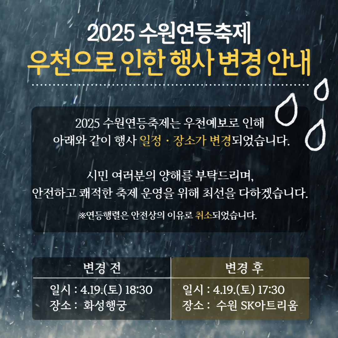 「2025 수원축제」 ○ 날 짜: 2025. 4. 19.(토) 17:30 ○ 장 소: 수원SK아트리움 ○ 내 용: 봉축법요식, 봉축문화제, 위로콘서트 등 ○ 주 최: 수원시회보존위원회(위원장: 수산스님) ※ 올해 연등행렬은 취소되고, 봉축법요식과 위로콘서트가 수원SK아트리움에서 개최됩니다. |