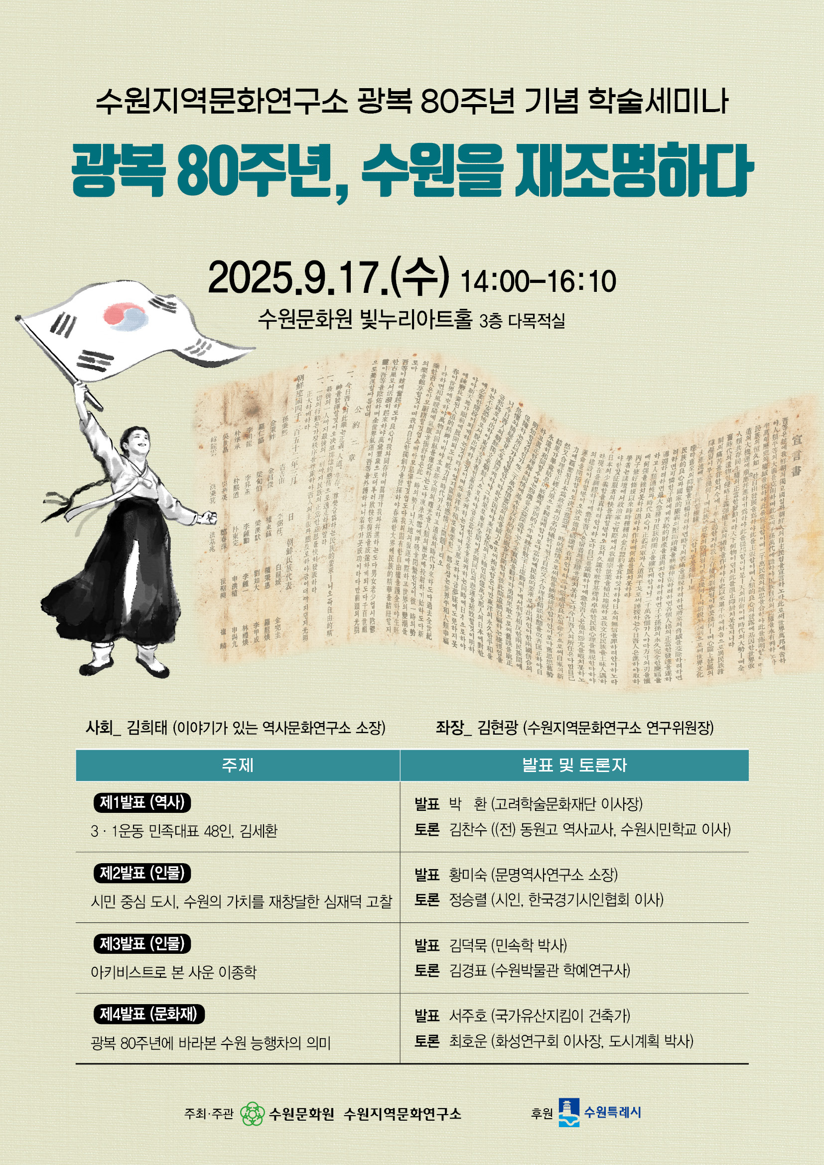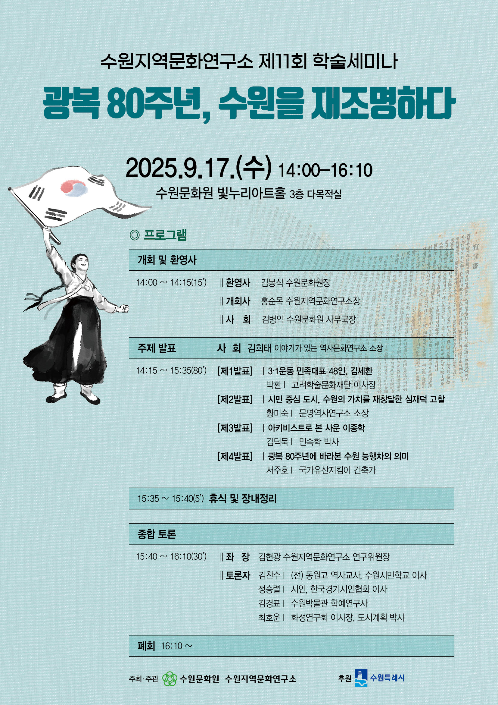 | 2025 수원지역문화연구소 광복 80주년 기념 학술세미나 <광복 80주년, 수원을 재조명하다> | |