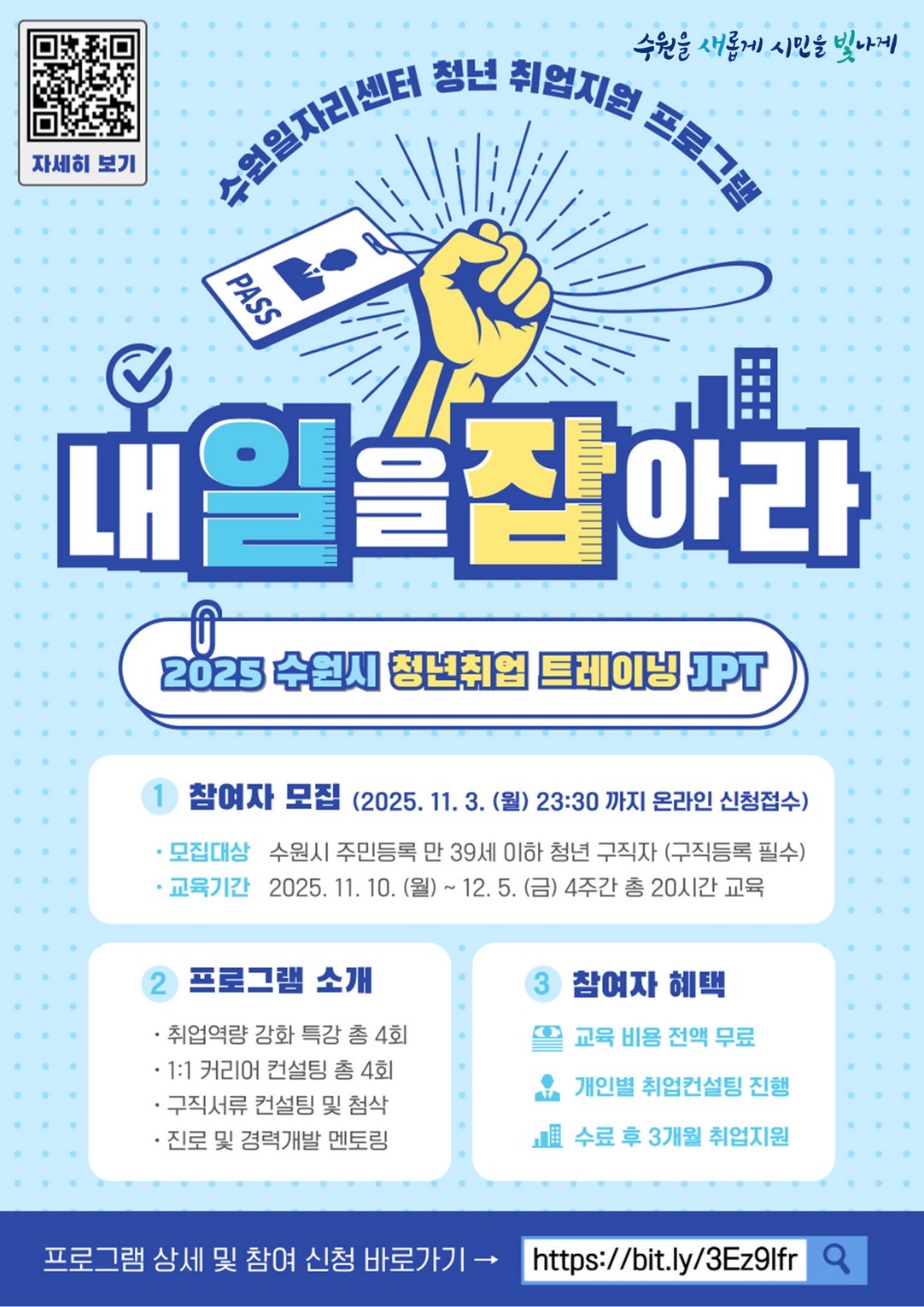2025년 장기 취업지원 프로그램 「청년취업 트레이닝 JPT 4기」를 아래와 같이 운영하오니, 관심있는 구직자들의 많은 참여 바랍니다. □ 모집개요 ❍ 모집기간 : 2025. 10. 10.(금) ~ 11. 3.(월) 23:30분까지 ❍ 모집인원 : 20명(전화인터뷰 후 선발) ❍ 모집대상 : 우리시 거주(주민등록상) 39세 이하 구직자 ❍ 접수방법 : https://naver.me/IxKdAetx 또는 교육 홍보물 내 QR코드 접속 후 참여신청 ※ 선정 후 교육 당일 불참 통보 또는 무단불참자의 경우, 이후 취업지원사업 참여 제한 □ 교육개요 ❍ 교육기간 : 2025. 11. 10.(월) ~ 12. 5.(금) 【4주간】 ❍ 교육시간 : 20시간 [취업교육 16시간 / 개별상담 4회(1회 1시간)] ❍ 교육장소 : 수원시 청년지원센터 청년바람지대, 수원일자리센터 ❍ 교육방법 - 취업교육 : 수원시 청년지원센터 청년바람지대 집합교육 - 개별상담 : 수원일자리센터 방문 1:1 대면상담 ❍ 교육내용(첨부자료 참조) ❍ 문 의 : ☎ 031-5191-2995 |