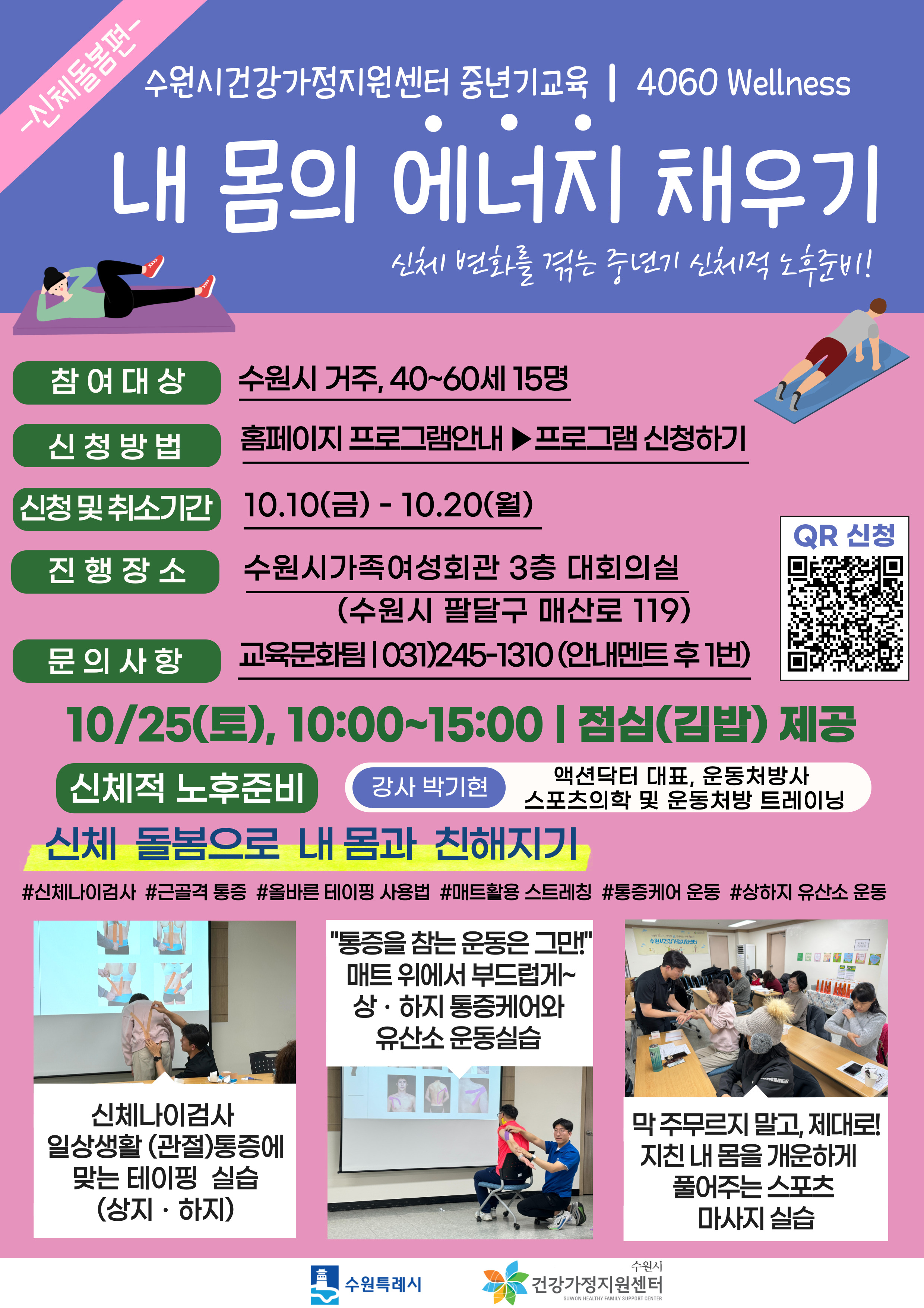 1. 사 업 명: 2025 중장년기교육 ‘내 몸의 에너지 채우기’ 2. 세부내용: 신체 변화를 겪는 중년기 신체적 노후준비 3. 진행일시: 2025. 10. 25(토), 10:00~15:00 4. 진행장소: 수원시가족여성회관 3층 대회의실 5. 대 상: 수원시 거주, 생애전환기에 있는 40-60세 15명 6. 신청기간: 10/10(금) ~ 10/20(월), 수원시건강가정지원센터 홈페이지 프로그램 신청 7. 문 의: 031)245-1310, 교육문화팀 |