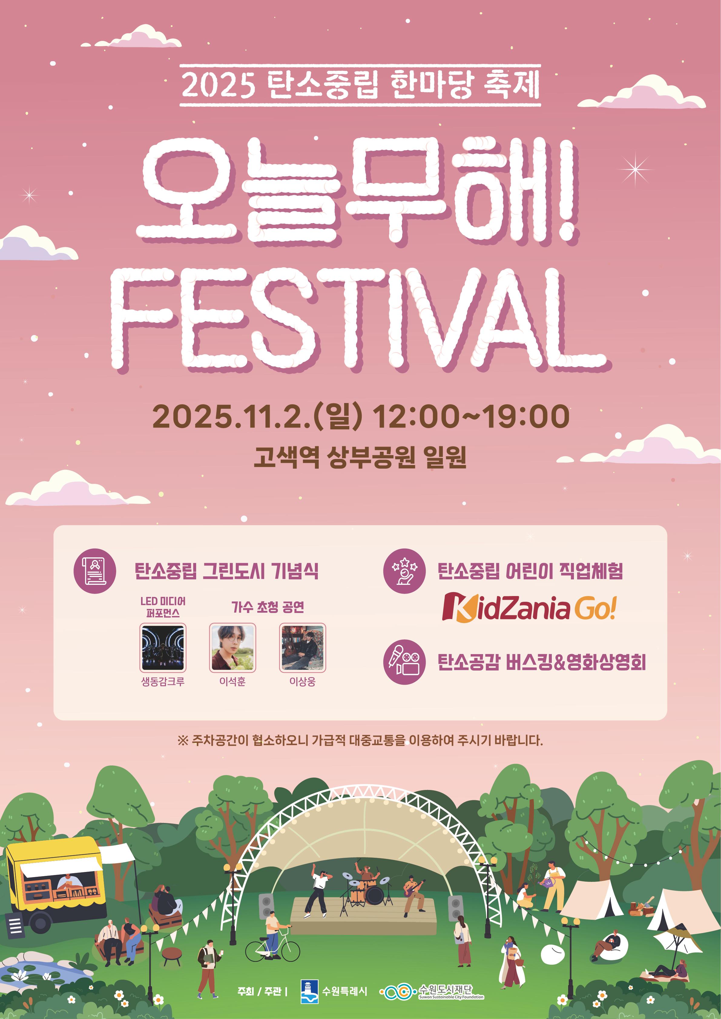 시민과 함께하는 탄소중립 한마당! "오늘무해! 페스티벌" 을 개최합니다. 탄소중립 미디어 퍼포먼스, 체험부스, 탄소중립 어린이 직업체험 등 다양한 기획행사를 즐기며 일상 속 탄소중립 생활실천을 함께 다짐해요! 많은 관심과 방문 부탁드립니다. ○ 일 시: 2025. 11. 2.(일) 12:00 ~ 19:00 ○ 장 소: 고색역 상부공원 ○ 주 제: 지구로운 일상, 무해로운 삶 ○ 내 용 ⦁ (공식행사) 기념식, 탄소중립 미디어 퍼포먼스, 기념식수 등 ⦁ (무대공연) 탄소중립 어린이 합창공연, 가수 초청공연 ⦁ (기획행사) 탄소공감 버스킹 및 영화상영회, 찾아가는 키자니아 탄소중립 어린이 직업체험 등 ⦁ (체 험) 그린캠크닉존 운영, 탄소중립 체험 및 홍보부스 ○ 주최/주관: 수원시/수원도시재단