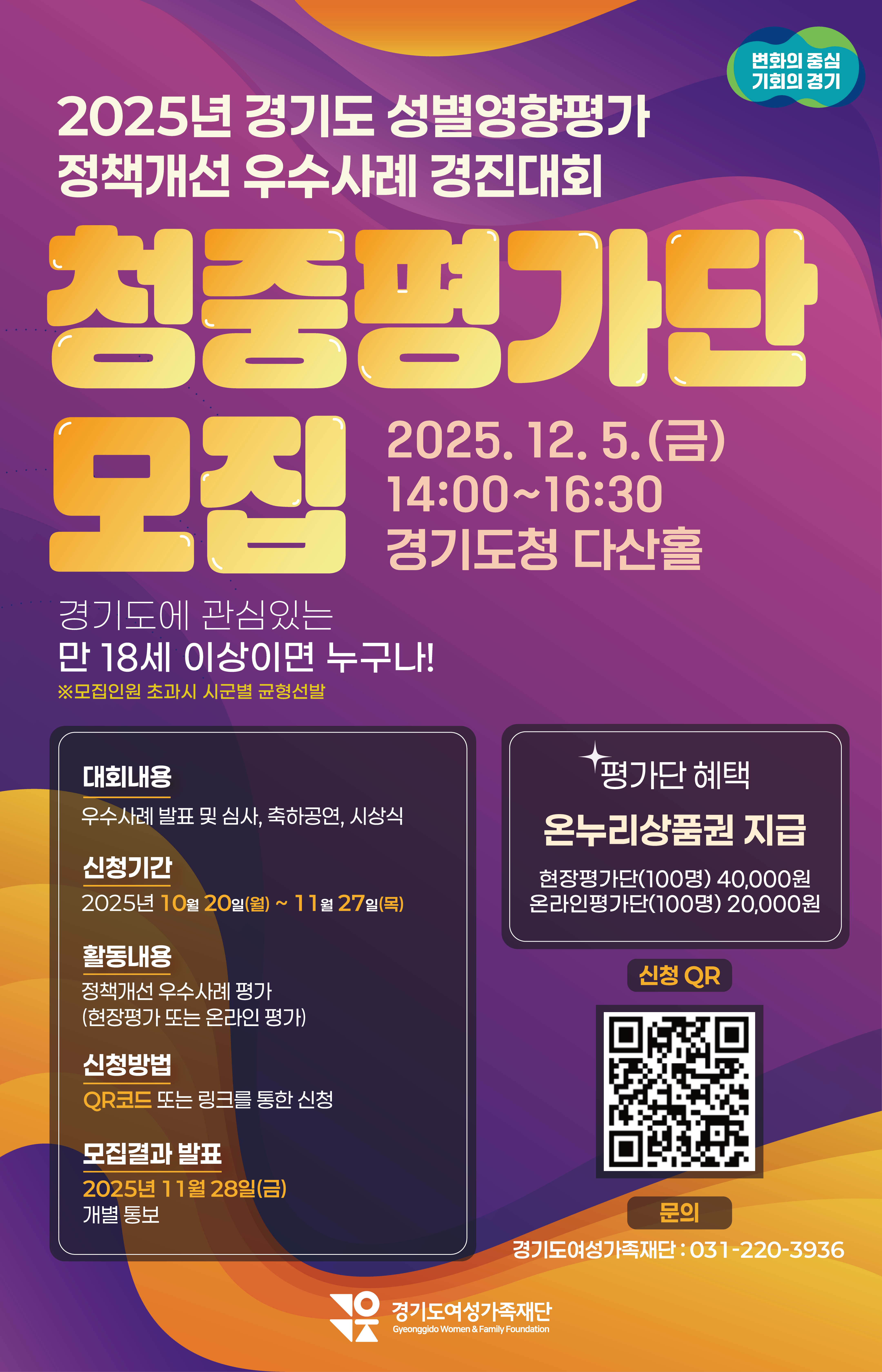 2025년 경기도 성별영향평가 정책개선 우수사례 경진대회 청중평가단 모집 안내 ※ 참고: 수원시의 성별영향평가 대상사업 2개가 경기도의 성별영향평가 정책개선 우수사례(총10개)로 선정되었으며 우수사례의 포상 순위는 아래와 같이 '경기도 성별영향평가 정책개선 우수사례 경진대회'에서 청중평가단 등의 심사에 따라 최종 결정됩니다. 많은 수원시민들이 청중평가단으로 참여하여 경기도 성평등 증진에 기여하고 수원시 사업도 응원할 수 있도록 널리 알려주시기 바랍니다. 2025년 경기도 성별영향평가 정책개선 우수사례 경진대회 청중평가단 모집 경기도는 성별영향평가를 통해 보다 성평등한 정책을 만들어가고 있습니다. 경기도와 31개 시·군에서 추진한 정책 중 성별영향평가로 개선된 성과를 공유하고 우수사례를 확산하기 위해 「2025년 경기도 성별영향평가 정책개선 우수사례 경진대회」를 개최합니다. 성평등 정책의 지속적인 발전을 함께 이끌어갈 청중평가단으로 도민 여러분의 참여를 기다립니다! ○ 행 사 명 : 2025년 경기도 성별영향평가 정책개선 우수사례 경진대회 ○ 일 시 : 2025년 12월 5일 (금) 14:00~16:30 ○ 장 소 : 경기도청 다산홀 및 온라인 생중계(Youtube) ○ 내 용 : 우수사례 발표 및 심사, 축하공연, 시상식 ○ 문 의 : 경기도여성가족재단 031-220-3936 ※ 신청 링크: https://forms.gle/TWmkZba8xpCZiUDA6 |