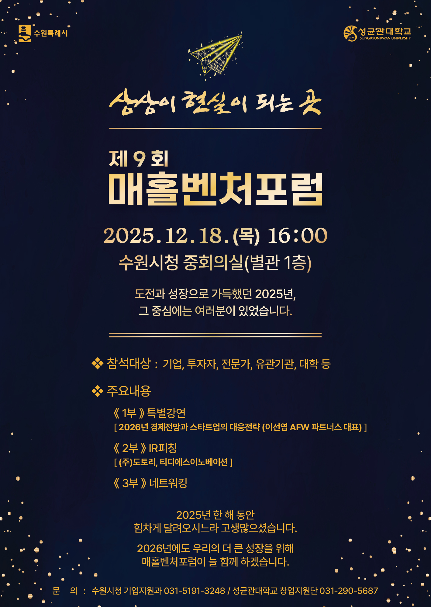 수원시에서는 기업 네트워킹 활성화를 통해 기업 성장 제고를 위하여 기업, 투자사, 전문가 등의 정기적 교류의 장을 제공하는 '매홀벤처포럼'을 매월 운영하고 있습니다. '제9회 매홀벤처포럼'을 아래와 같이 개최합니다. --------------------------------------------------------------------------------------- [행사개요] 0. 일시 : 2025. 12. 18.(목) 16:00~18:00 0. 장소 : 수원시청 중회의실(수원시 팔달구 효원로 241, 별관 1층) 0. 참석대상 : 대·중견·중소기업 및 창업기업, 새빛펀드 운용사 및 투자사, 유관기관, 대학 등 0. 주요내용 - 강연 : 2026년 경제전망과 기업대응전략 [이선엽 AFW파트너스 대표] - IR피칭 : (주)도토리, 티디에스이노베이션 - 네트워킹 : 다과 및 음료 제공 0. 신청방법 : 첨부된 회원가입신청서 이메일 제출 (yina0222@korea.kr) 0. 문의 : 수원시청 기업지원과 (031-5191-3248) --------------------------------------------------------------------------------------- 기업,투자자,전문가 등이 모두 한자리에 모이는 만큼 네트워크를 쌓고 기업홍보를 할 수 있는 좋은 기회입니다! 관심있는 기업 및 기관에서는 회원가입 신청서를 제출해주시고 많은 참석 바랍니다! |