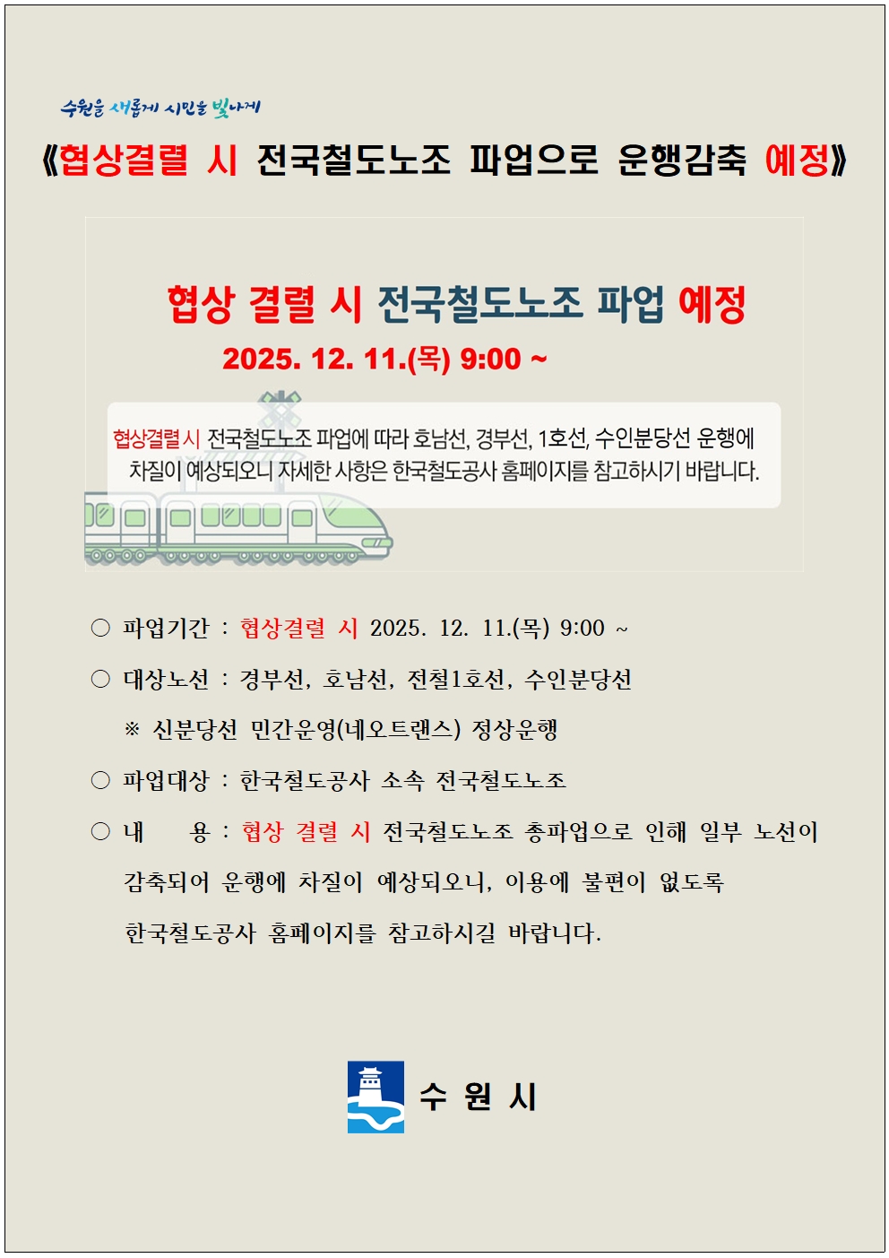 [협상결렬 시 전국철도노조 파업 예정] ○ 파업기간 : 협상결렬 시 2025. 12. 11.(목) 9:00 ~ ○ 대상노선 : 경부선, 호남선, 전철1호선, 수인분당선 ※ 신분당선 민간운영(네오트랜스) 정상운행 ○ 파업대상 : 한국철도공사 소속 전국철도노조 ○ 내 용 : 협상 결렬 시 전국철도노조 총파업으로 인해 일부 노선이 감축되어 운행에 차질이 예상되오니, 이용에 불편이 없도록 한국철도공사 홈페이지를 참고하시길 바랍니다. |