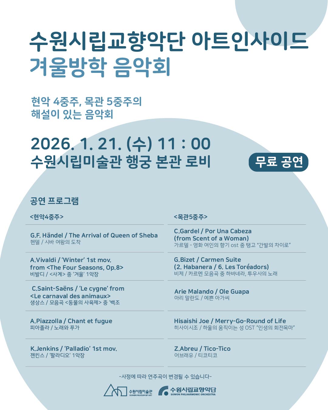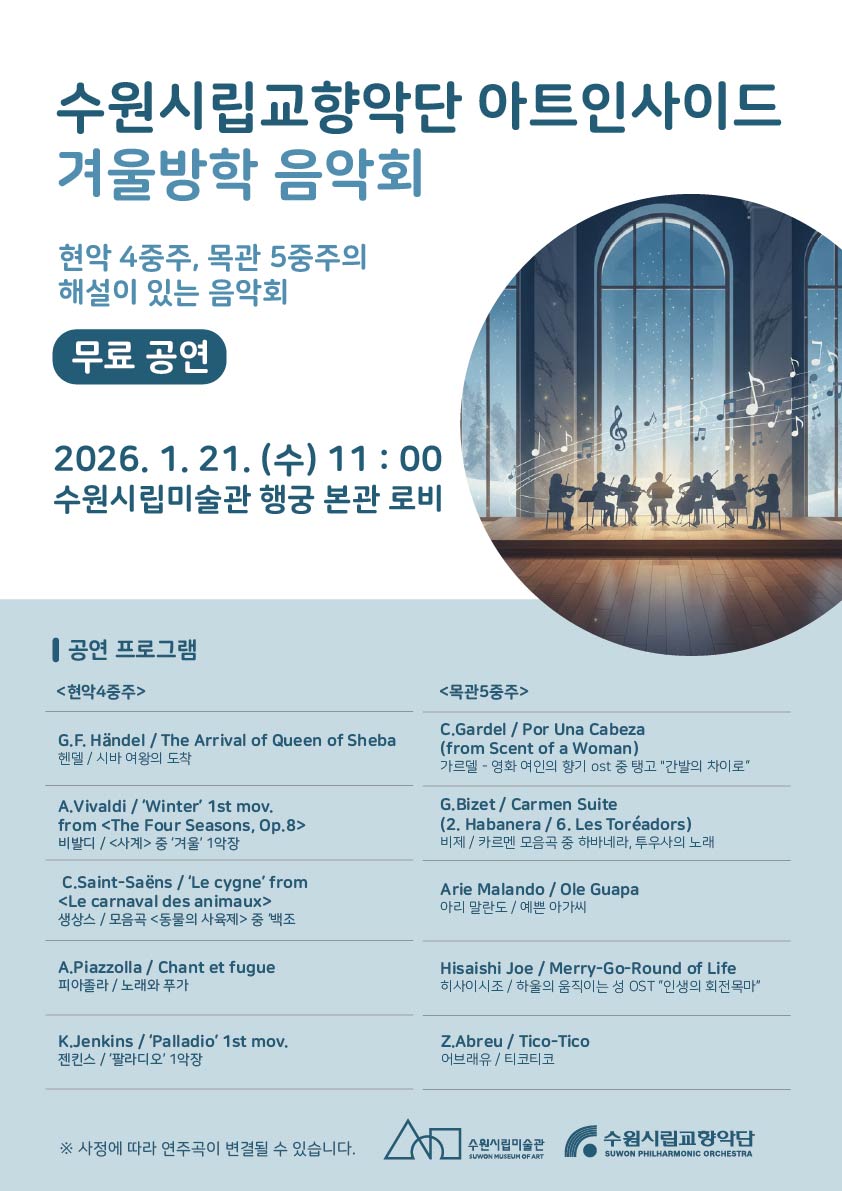 | 수원시립교향악단 아트인사이드 <겨울방학 음악회>1월 21일 11시 무료 공연! 🎻🎶 | |