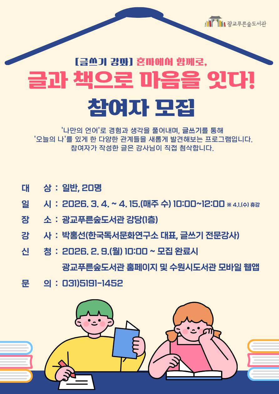| 광교푸른숲도서관 「혼자에서 함께로, 글과 책으로 마음을 잇다!」 참가자 모집 | |