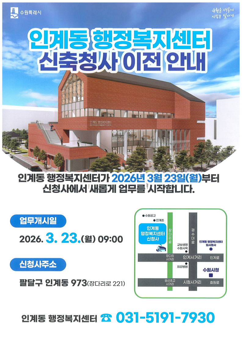 인계동 행정복지센터 신축 청사 완공에 따라 다음과 같이 청사를 이전하여 업무 개시 예정입니다. 시민 여러분의 많은 관심과 이용 부탁드립니다. □ 개 요 ○ 업무 개시일: 2026. 3. 23.(월) 09:00 ○ 신청사 위치: 팔달구 장다리로 221 (인계동 973) ※ 상세 위치 붙임 참조 ○ 기존 청사 운영: 2026. 3. 20.(금) 18:00 종료 (KBS수원센터 내) ○ 문의 전화: 031-5191-7930 ![]() |