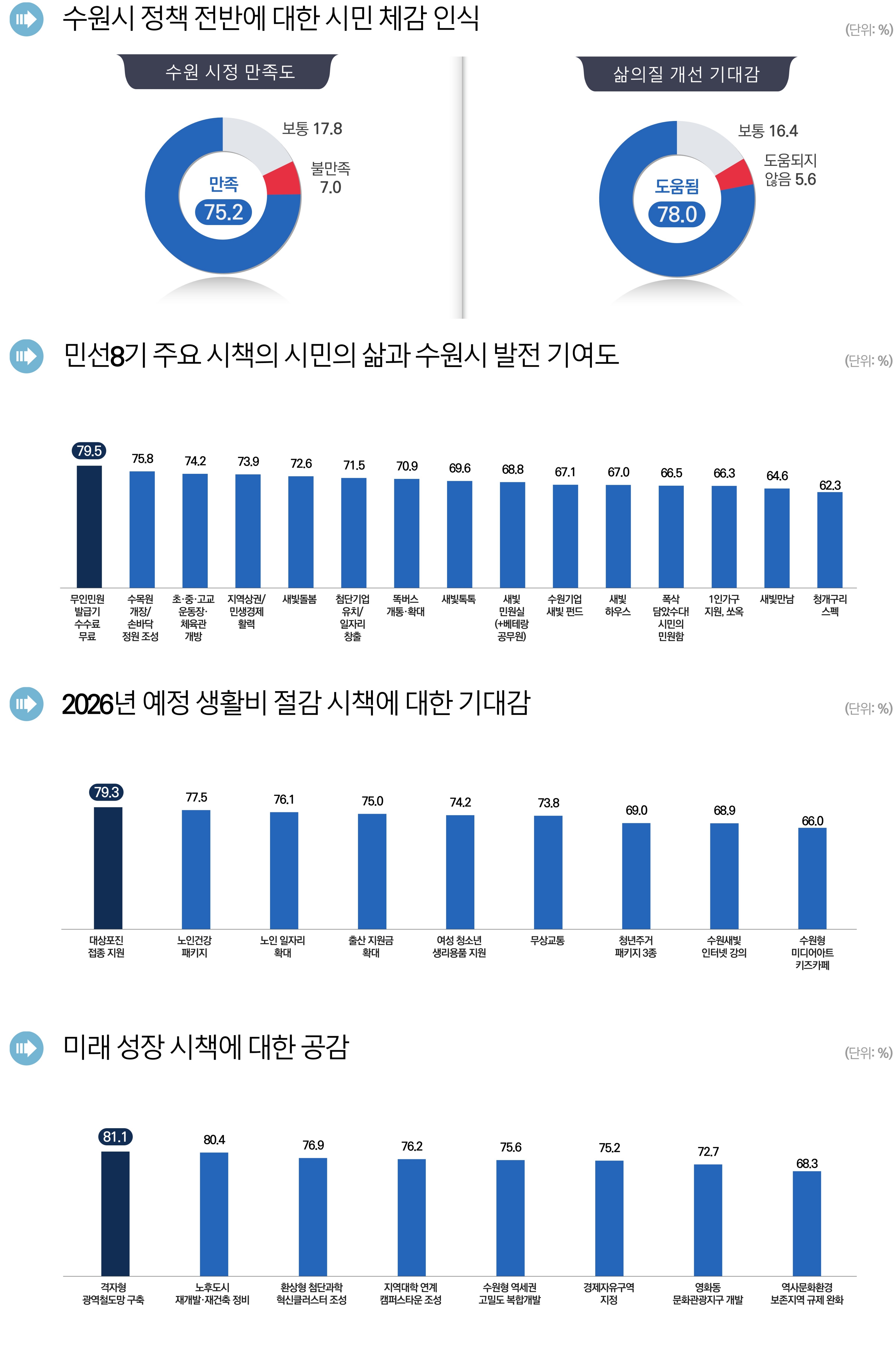 수원시민 4명 중 3명은 “수원시가 일을 잘하고 있다”고 생각하는 것으로 나타났다. 시민 일상과 밀접한 생활밀착형 정책이 시정 만족도를 높이고 있는 것으로 보인다. 수원시정연구원이 발표한 ‘수원특례시 정책 시민체감 인식조사’ 결과에 따르면 응답자의 75.2%가 “수원시가 일을 잘하고 있다”고 답했다. ‘보통’은 17.8%, ‘불만족’은 7.0%에 그쳐 시정 신뢰도가 안정적인 수준을 유지하는 것으로 분석됐다. 이번 조사는 케이스탯리서치에 의뢰해 12월 11일부터 17일까지 수원에 거주하는 19세 이상 시민 3355명을 대상으로 진행했다. 시정 만족 이유, 정책 방향 공감·삶에 도움되는 정책 많아서 시정에 만족하는 이유는 ‘수원시 정책 추진 방향에 공감해서’가 22.0%로 가장 많았고, ‘내 삶에 도움 되는 정책이 많아서’(21.8%), ‘시민과의 소통·경청을 잘해서’(17.6%), ‘정책 추진력, 추진 속도가 빨라서’(13.4%)가 뒤를 이었다. 응답자의 78.0%는 ‘수원시 정책이 내 삶을 더 좋게 만드는 데 도움이 될 것’이라고 생각했다. 시민들이 체감한 정책은 일상 속 불편을 줄이거나 경제적 부담을 낮춰주는 실속형 사업들이었다. 경제적 부담 낮추고, 일상 속 불편 줄여주는 정책 호평 민선 8기 주요 시책 중 시민 삶·수원시 발전에 기여도가 가장 높은 정책으로 ‘무인민원발급기 수수료 무료’가 79.5%를 꼽았다. 수목원 개장/손바닥정원 조성(75.8%), 초중고교 운동장·체육관 개방(74.2%), 지역 상권/민생경제 활성화(73.9%) 등이 뒤를 이었다. 수원시가 내년 1월부터 시행하는 ‘새빛생활비 패키지 사업’에 대한 기대감도 높았다. 새빛생활비 절감 패키지 기대감 높아 가장 기대되는 정책으로는 ‘대상포진 접종 지원’(79.3%)이 1위에 올랐고, ‘노인 일자리 확대’(76.1%), ‘출산 지원금 확대’(75.0%), ‘여성 청소년 생리용품 지원’(74.2%), ‘사회초년생 청년, 어르신, 장애인 무상교통’(73.8%) 순이었다. 고물가 시대에 의료비와 교통비 등을 줄여주는 정책에 대한 시민들의 갈증이 반영된 것으로 보인다. 시민들이 생각하는 도시 중장기 발전을 위한 미래 성장 시책은 ‘교통’과 ‘주거’가 핵심이었다. 격자형 광역철도망구축, 노후도시 재개발·재건축 정비, 환상형 첨단과학 혁신클러스터 조성 등 수원의 미래를 만들어가는 정책에 대한 공감도는 80% 내외였다. 격자형 광역철도망구축·노후도시 정비 정책, 공감대 80% 이상 ‘격자형 광역철도망구축’(81.8%), ‘노후도시 재개발·재건축 정비’(80.4%)는 80% 이상의 압도적인 공감대를 형성했고, 첨단과학 혁신클러스터 조성(76.9%), 지역대학 연계 캠퍼스타운 조성(76.2%), 수원형 역세권 고밀도 복합개발(75.6%) 등 도시 성장 전략도 고른 지지를 받았다. 김성진 수원정연구원장은 “이번 조사 결과는 시민들이 정책을 통해 일상에 실제로 얼마나 편해졌는가를 시정 평가의 핵심 척도로 삼고 있음을 보여준다”며 “생활밀착형 정책의 체감도를 계속 높여가면서, 미래 성장 정책이 시민 개개인 삶과 어떻게 연결되는지 끊임없이 소통하는 노력이 필요하다”고 말했다. |