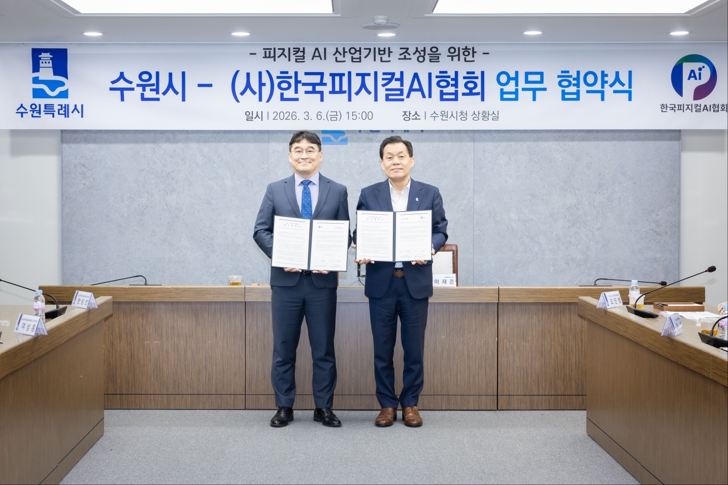수원특례시·(사)한국피지컬에이아이(AI)협회, 피지컬 인공지능(AI) 산업 활성화 위해 힘 모은다 피지컬 인공지능(AI) 협력 업무협약 체결하고, 협력 약속