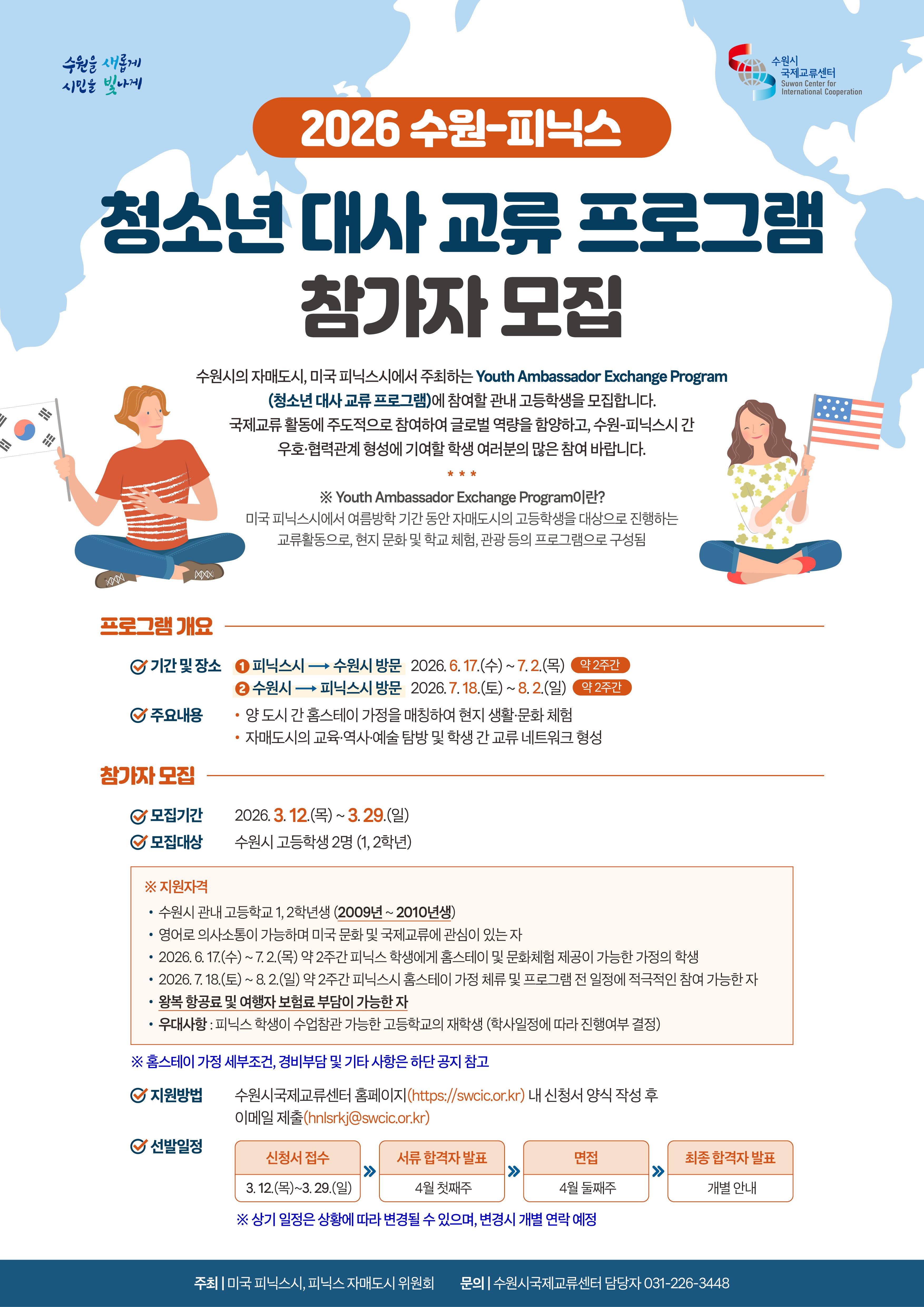 | 수원시국제교류센터, ‘2026 수원-피닉스 청소년 대사 교류 프로그램’ 참가자 모집 | |||||||||||||