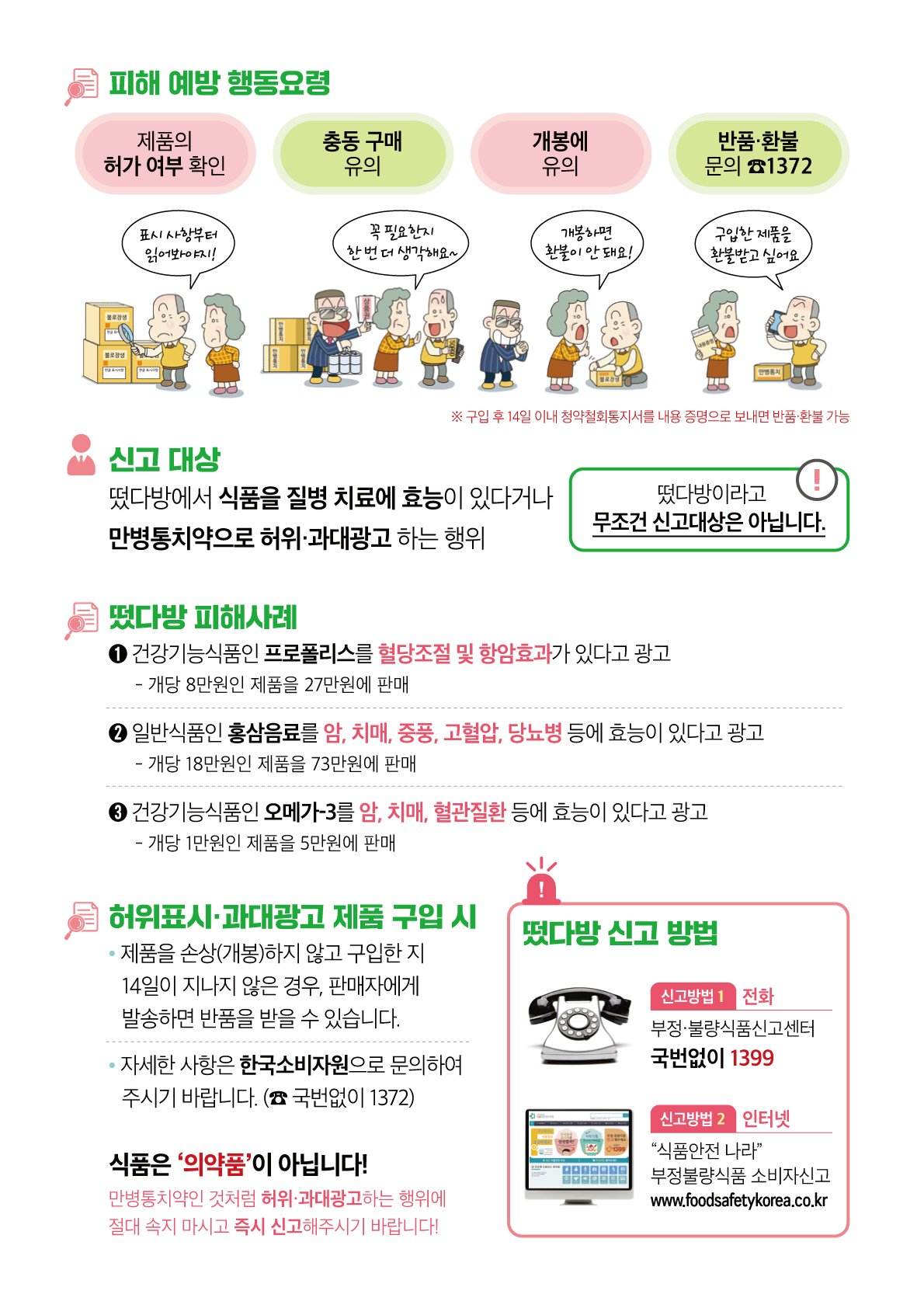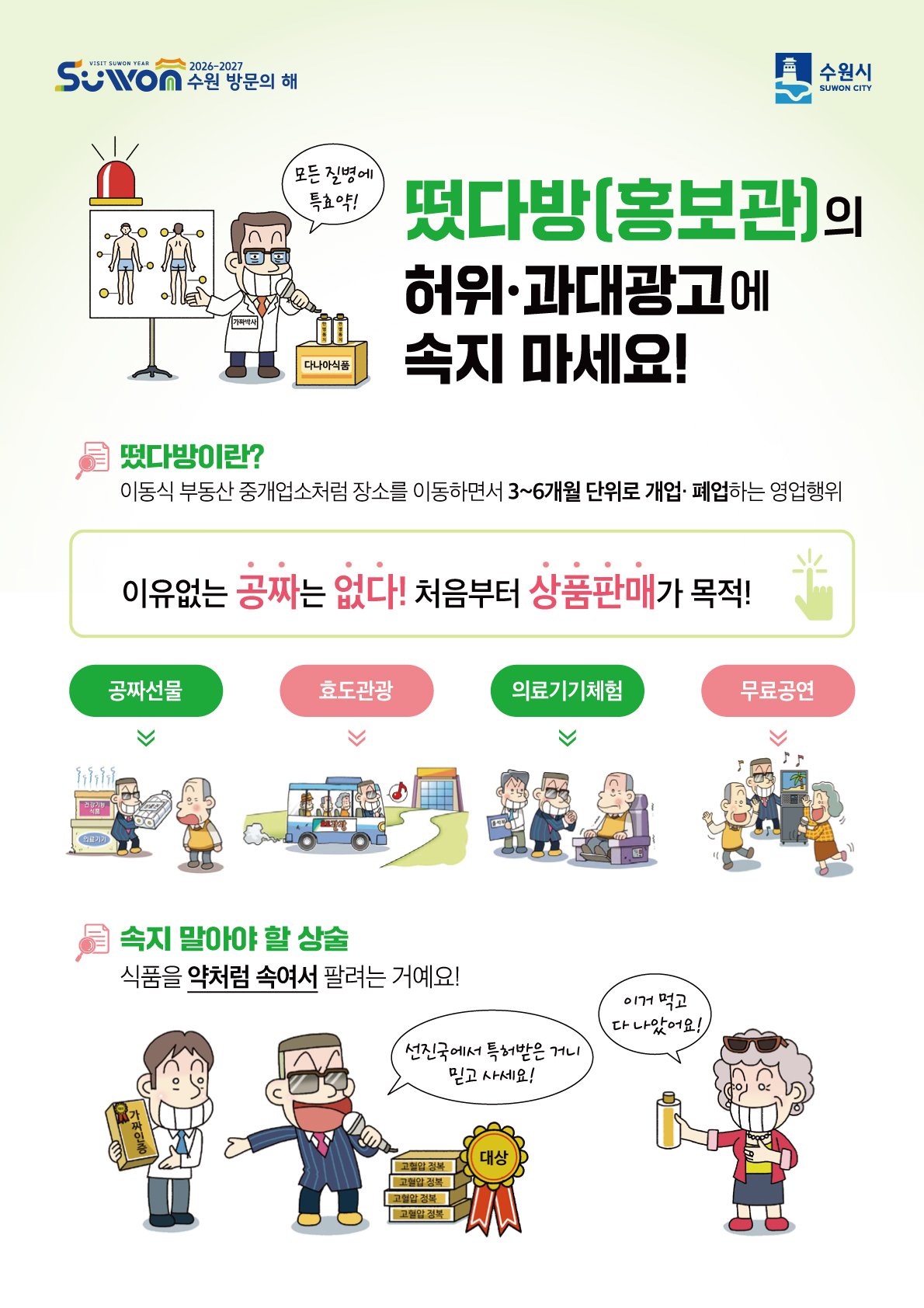 수원특례시가 15일부터 관내 경로당을 중심으로 ‘떴다방(홍보관)’ 피해 예방 방법을 홍보하고, 떴다방을 점검한다. 떴다방(홍보관)은 건강기능식품이나 일반식품을 질병 치료에 효과가 있는 것처럼 허위·과대 광고하며 고령층에게 고가로 판매하는 신종 불법 판매 형태다. 무료 강좌나 경품 제공으로 어르신을 유인한 뒤 제품 구매를 유도하고, 장소를 옮겨 영업을 이어간다. 수원시는 6월 30일까지 시니어감시원 9명을 투입해 경로당을 순회하며 피해 사례를 수집하고, 올바른 식품 구매 요령과 신고 방법을 안내한다. 일반 식품을 건강기능식품으로 오인시키는 행위와 효능 과장 광고의 위험성을 알리고, 부정·불량식품신고센터(1399) 이용을 독려한다. 또 4월 20일부터 7월 3일까지 위생지도팀 직원 5명이 떴다방(홍보관)과 체험방 등을 점검해 허위·과대 광고와 관련 법 위반 여부를 확인하고, 위반업체는 행정처분과 고발 등으로 대응할 계획이다. 수원시 관계자는 “사전 예방과 점검을 병행해 피해를 차단하겠다”며 “의심스러운 판매를 접한 어르신들께서는 즉시 신고해 주시길 바란다”고 말했다. 떴다방(홍보관) 피해를 예방하려면 ▲제품 구매 전 가족과 상의 ▲효능을 과장하는 설명에 주의 ▲식품 유형과 표시사항 확인 ▲의심되는 판매 행위는 1399에 신고하기 등 행동 요령을 지켜야 한다. |