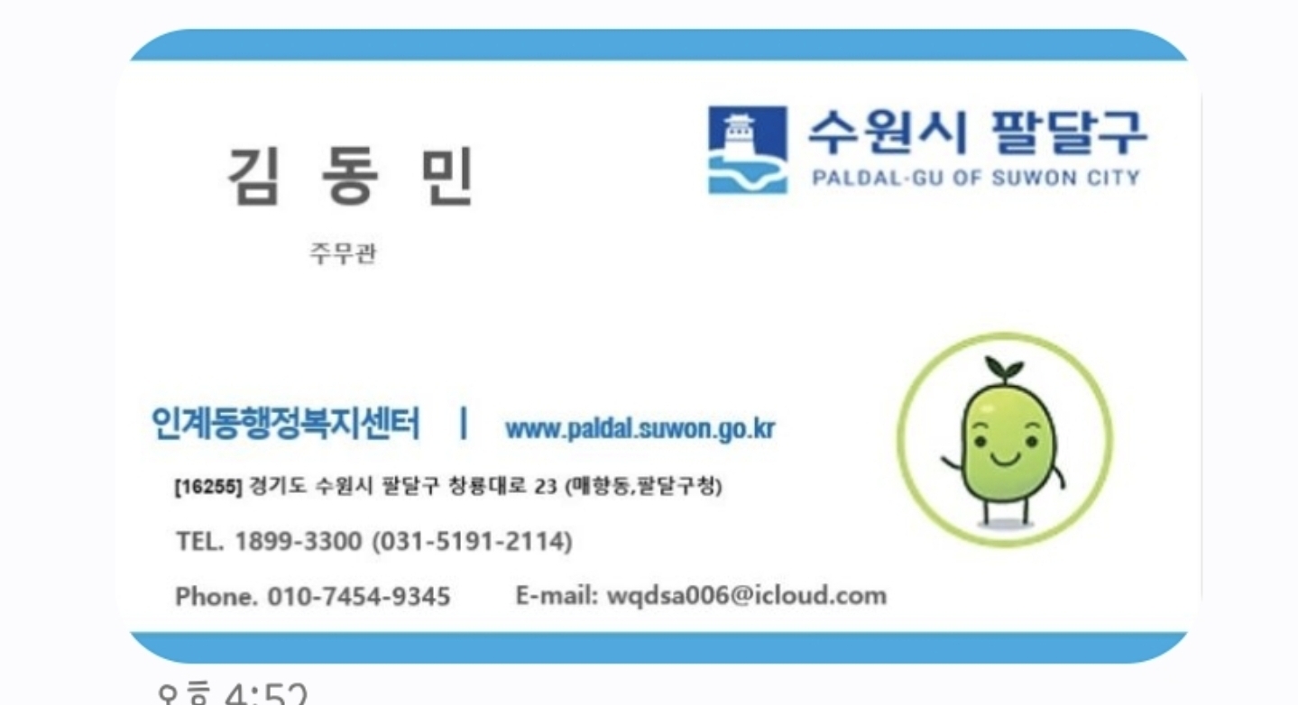 아내가 자영업을 하는데 인계동 행정복지센터로부터 큰 금액에 견적서 요청을 받게 돼서 재료 등등을 주문하기 전에 뭔가 수상한 느낌이 들어 031 5181 2114로 전화를 하여 명함의 진위 여부를 확인하였습니다.