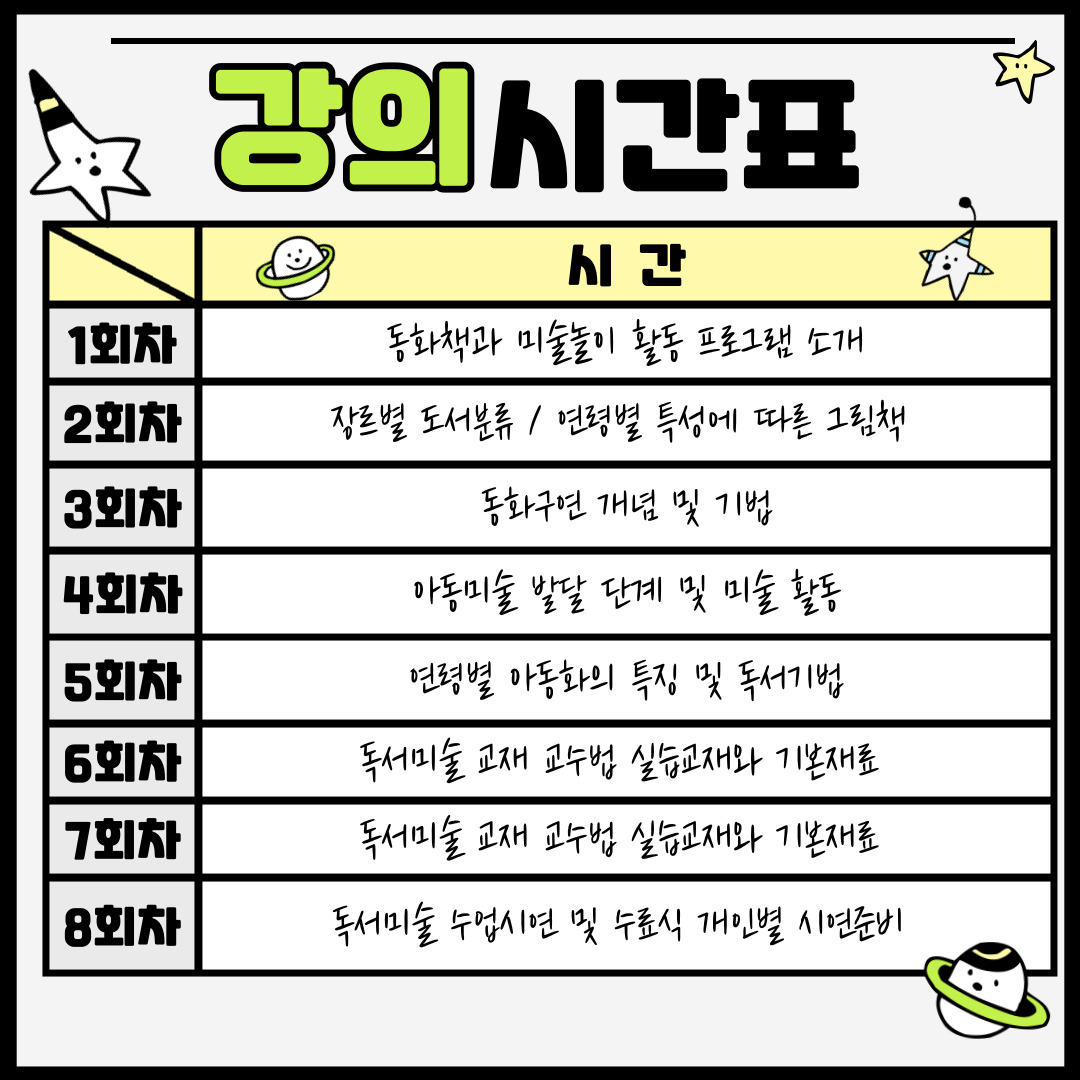 | 수강료 안내 | 아이들의 상상력을 키우고 미술활동을 통해 독서의 즐거움과 문해력을 넓일 수 있는 독서미술지도사 2급 자격증 취득 과정입니다. 취업분야로 복지관 및 문화센터 강사로 활동이 가능합니다! ★ 교육일정 : 2026년 4월 20(월) ~ 2026년 6월 15(월) 10:00-13:00 / 매주 월요일(8회)/ (휴강일 5.25) ★ 교육비 : 180,000원 ★ 교재 및 재료비: 60,000원(개강당일 강사님께 직접 납부) ★ 취업 시 강점 아동 대상 프로그램을 직접 기획·운영할 수 있는 능력 교육기관, 돌봄기관, 문화시설에서 활용도 높은 자격 프리랜서·파트타임·전일제 등 다양한 형태로 활동 가능 교육기관 및 돌봄 관련 분야 방과후 프로그램 수업 가능 동화구연. 독서토론, 창의미술 프로그램 운영 ※ 자격증 취득은 선택사항임 | ||